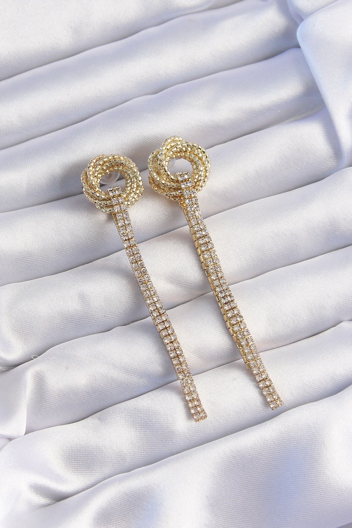 Pirinç Gold Renk Zirkon Taşlı Kıvrım Detay Sallantılı Küpe e_BKP9254