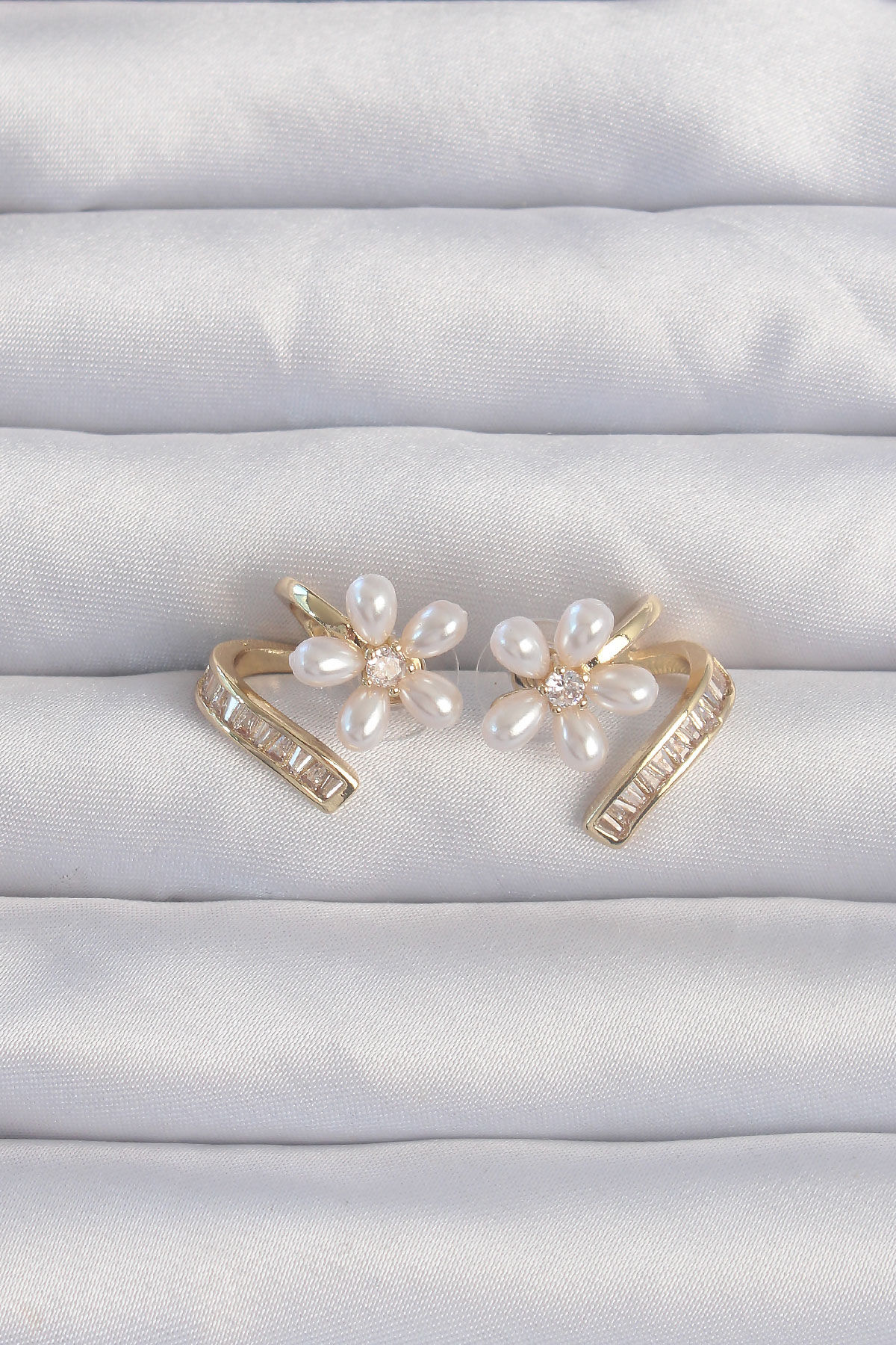 Pirinç Gold Renk Zirkon Taşlı Kıvrımlı İnci Çiçek Küpe e_BKP9277