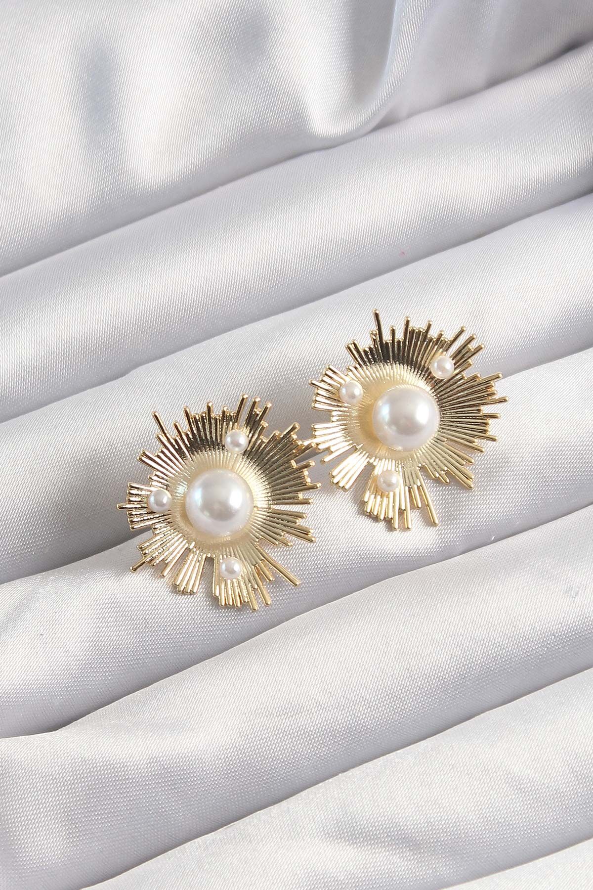 Pirinç Gold Renk Zirkon Taşlı Parlayan İnci Taneleri Küpe