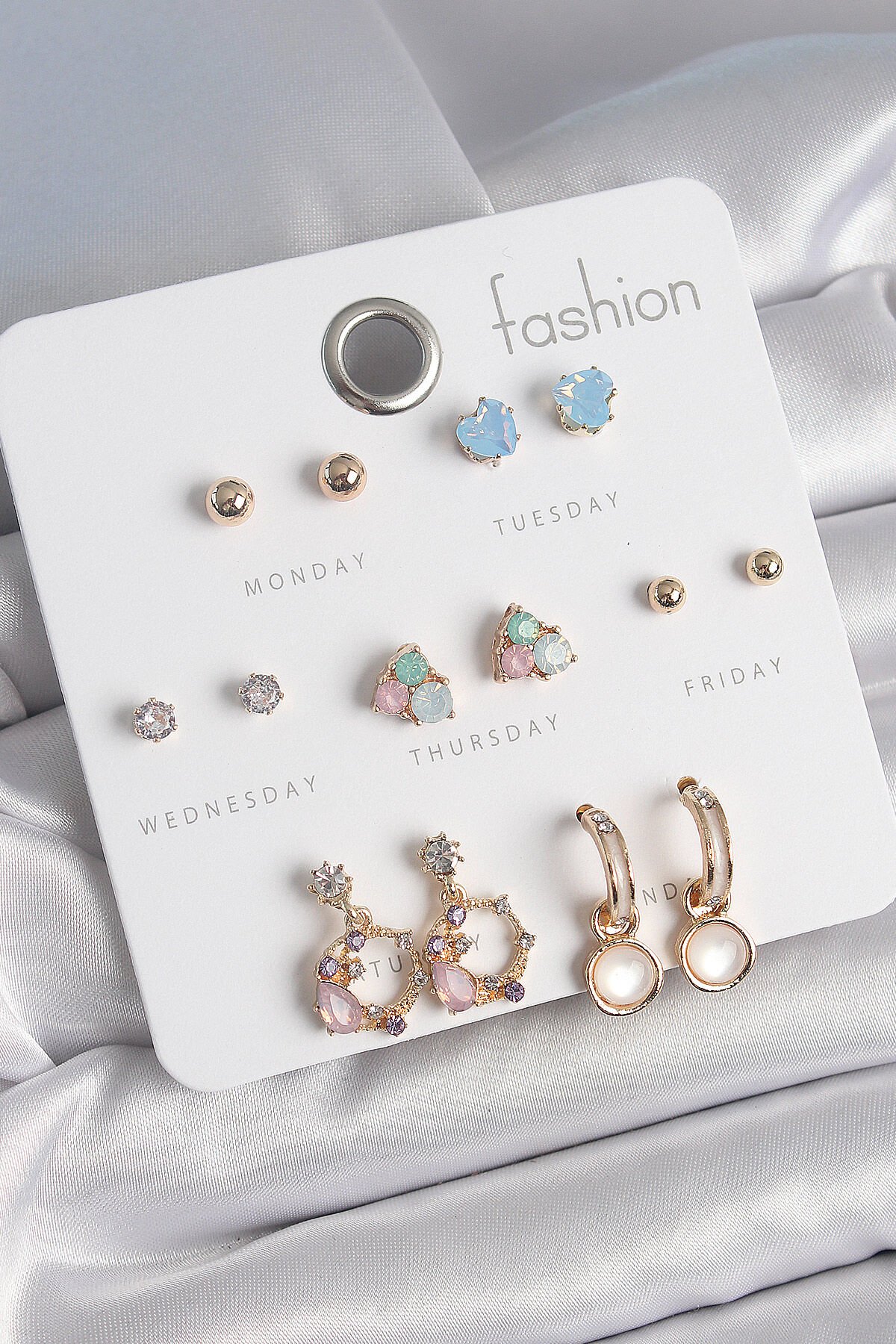 Pirinç Gold Renk Zirkon Taşlı Sallantı Halka Figür Kalp Detay 7 Çift Kadın Küpe