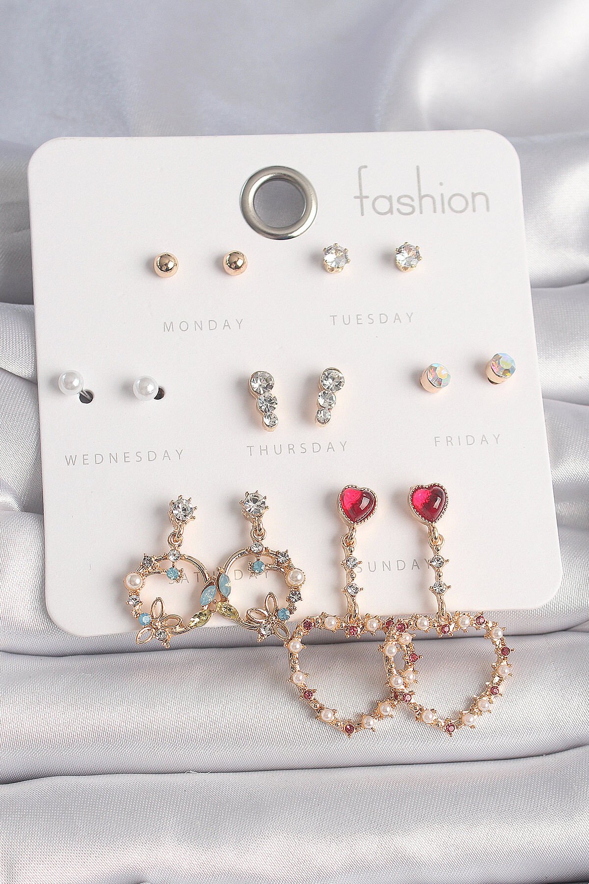Pirinç Gold Renk Zirkon Taşlı Sallantı Kalp Figür 7 Çift Kadın Küpe Seti