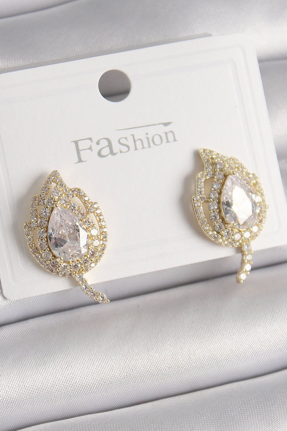 Pirinç Gold Renk Zirkon Taşlı Yaprak Model Kadın Küpe