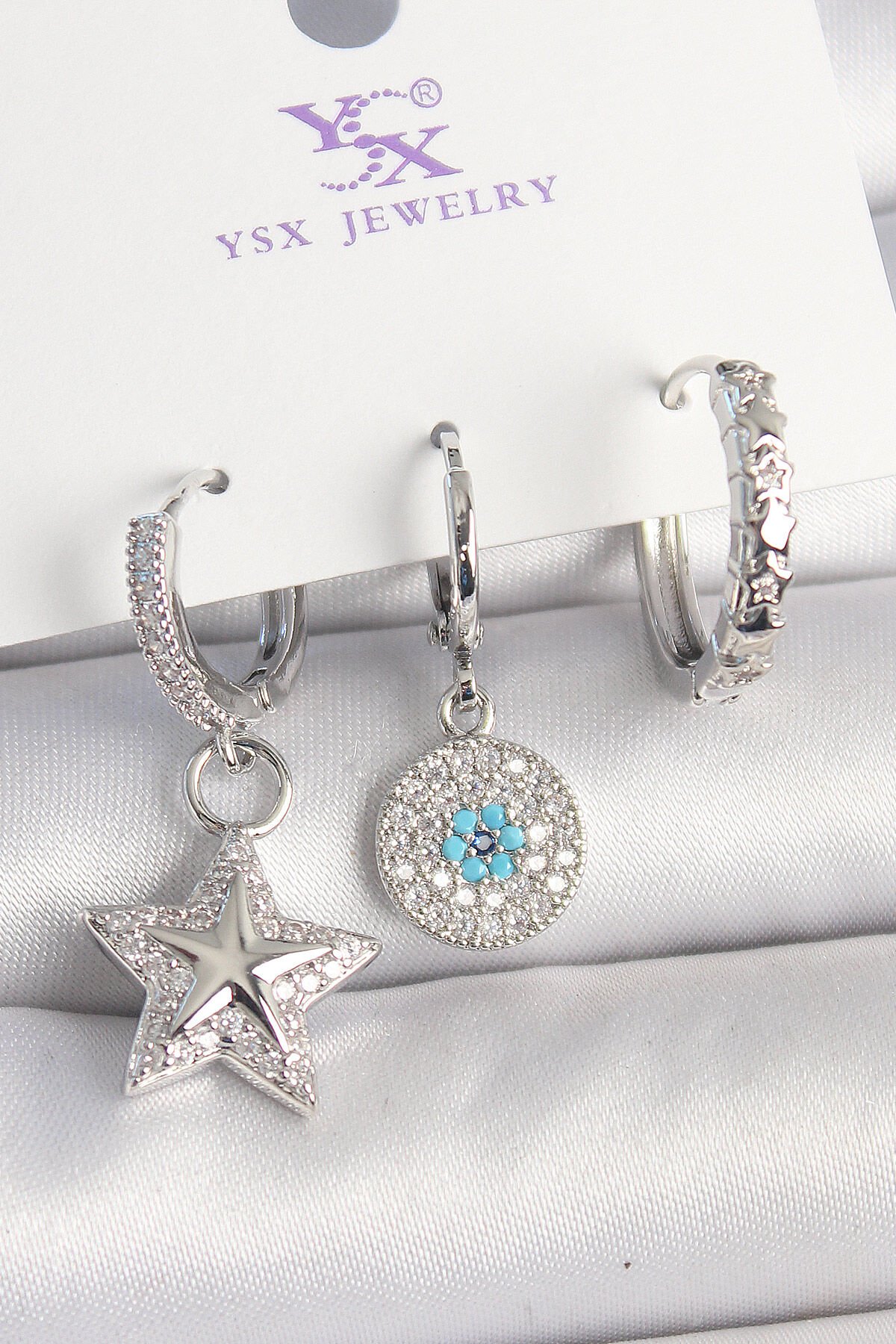 Pirinç Gold Renk Zirkon Taşlı Yıldız Model Nazar Boncuk Detay 3'Lü Kadın Kombin Küpe