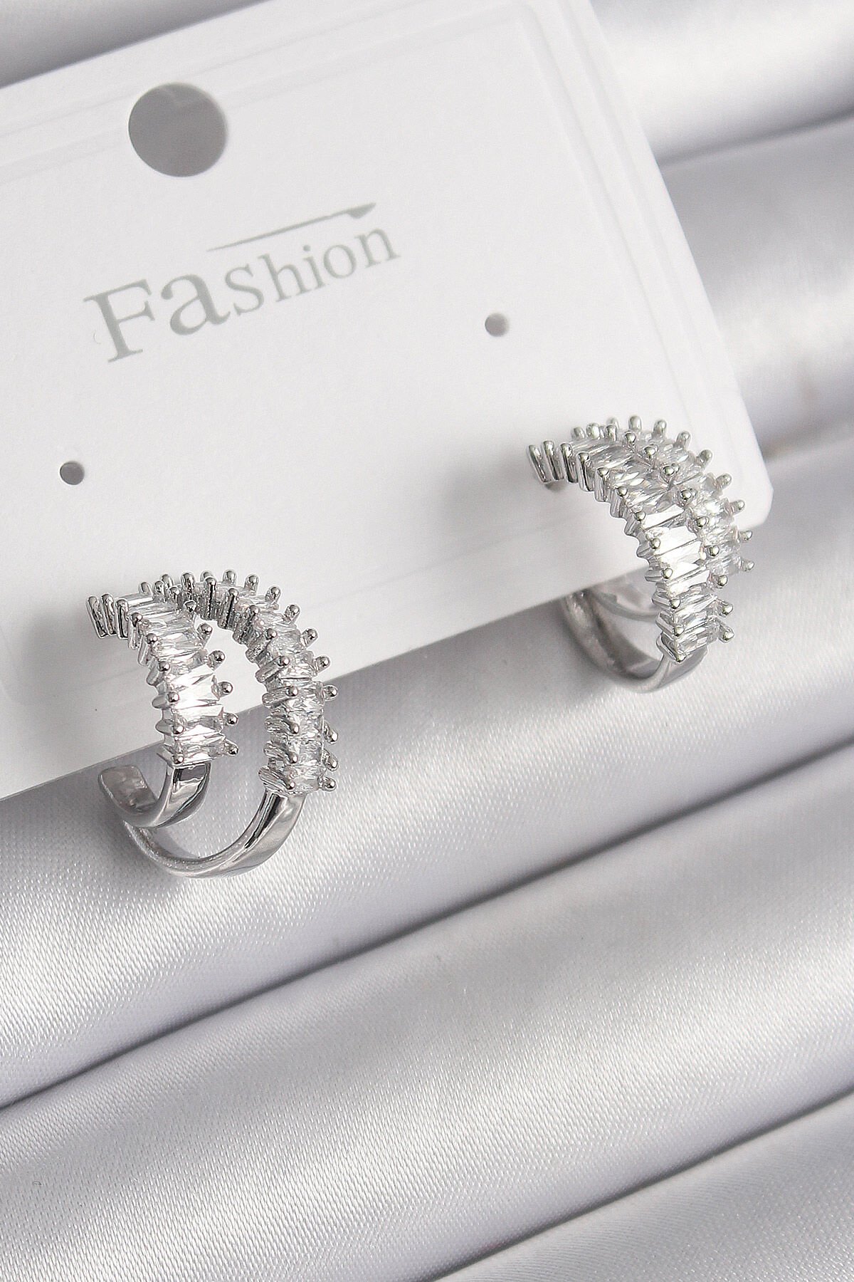 Pirinç Gümüş Renk 2'Li Zirkon Taşlı Halka Model Kadın Küpe