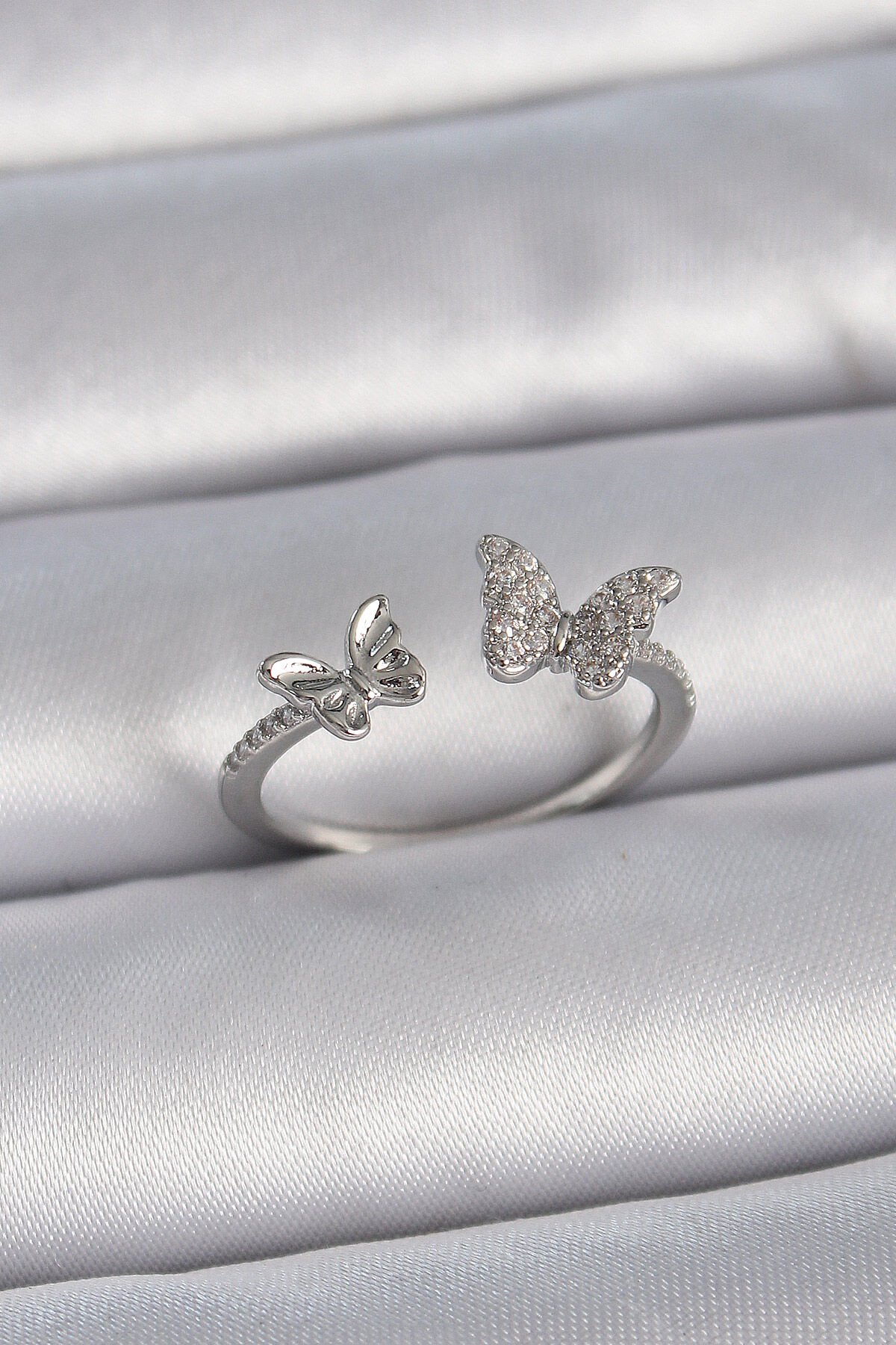 Pirinç Gümüş Renk Ayarlanabilir Zirkon Taşlı Kelebek Model Kadın Yüzük