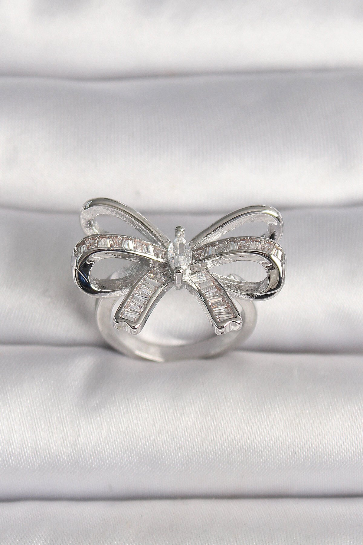Pirinç Gümüş Renk Ayarlanabilir Zirkon Taşlı Kurdele Model Kadın Yüzük