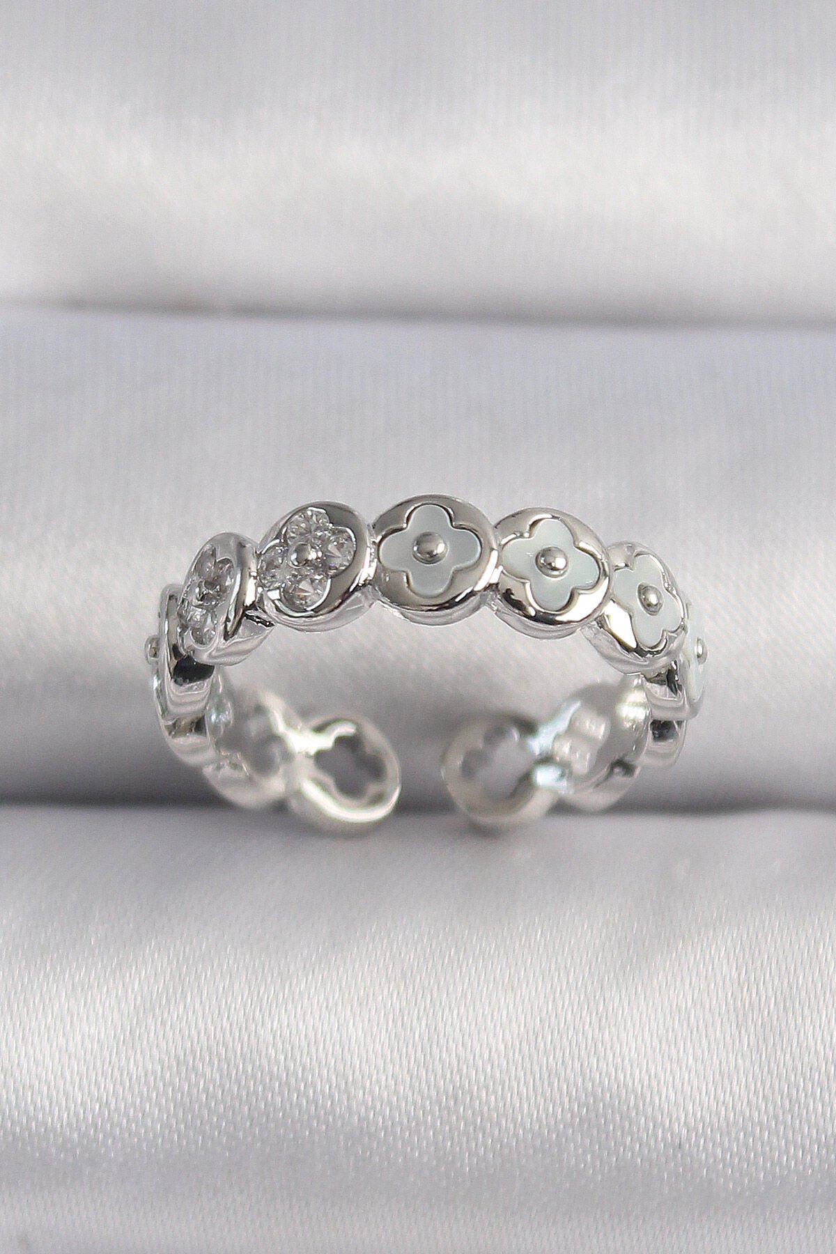 Pirinç Gümüş Renk Beyaz Sedefli Yonca Model Kadın Yüzük