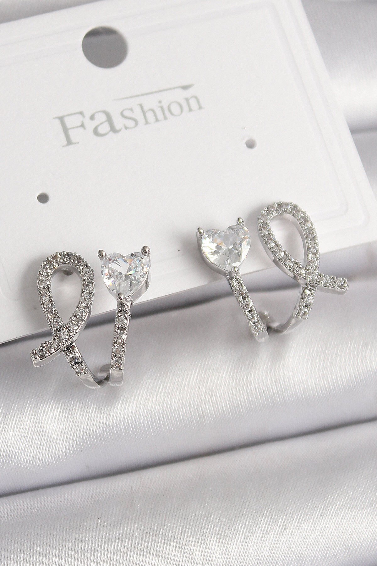 Pirinç Gümüş Renk Düğüm Model Zirkon Taşlı Kalp Detay Kadın Küpe