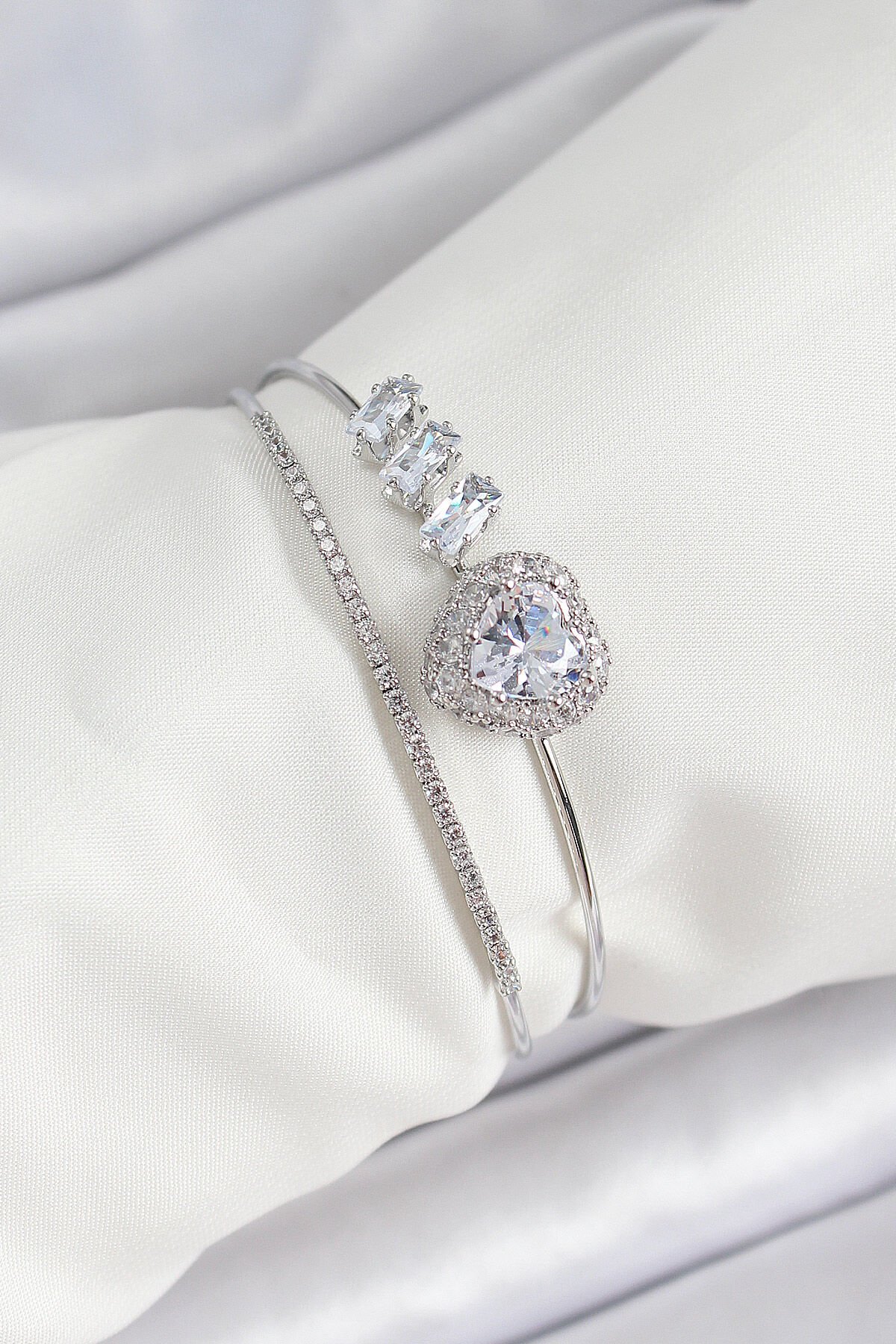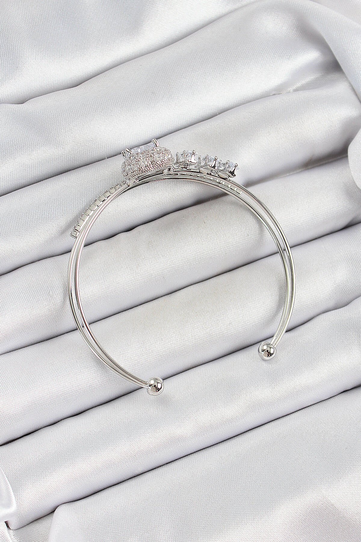 Pirinç Gümüş Renk Kalpli Zirkon Taşlı Kadın Bileklik
