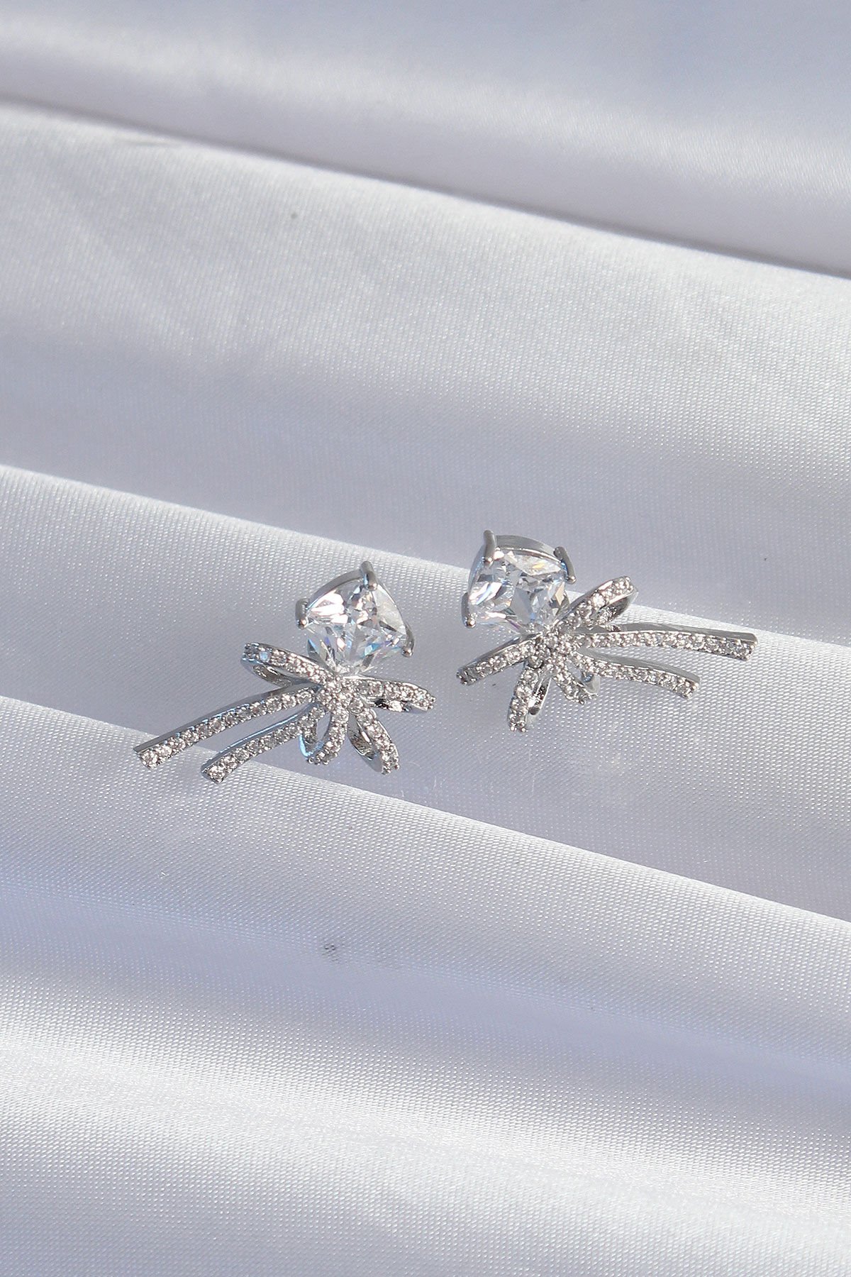 Pirinç Gümüş Renk Kare Zirkon Taşlı Fiyonk Küpe