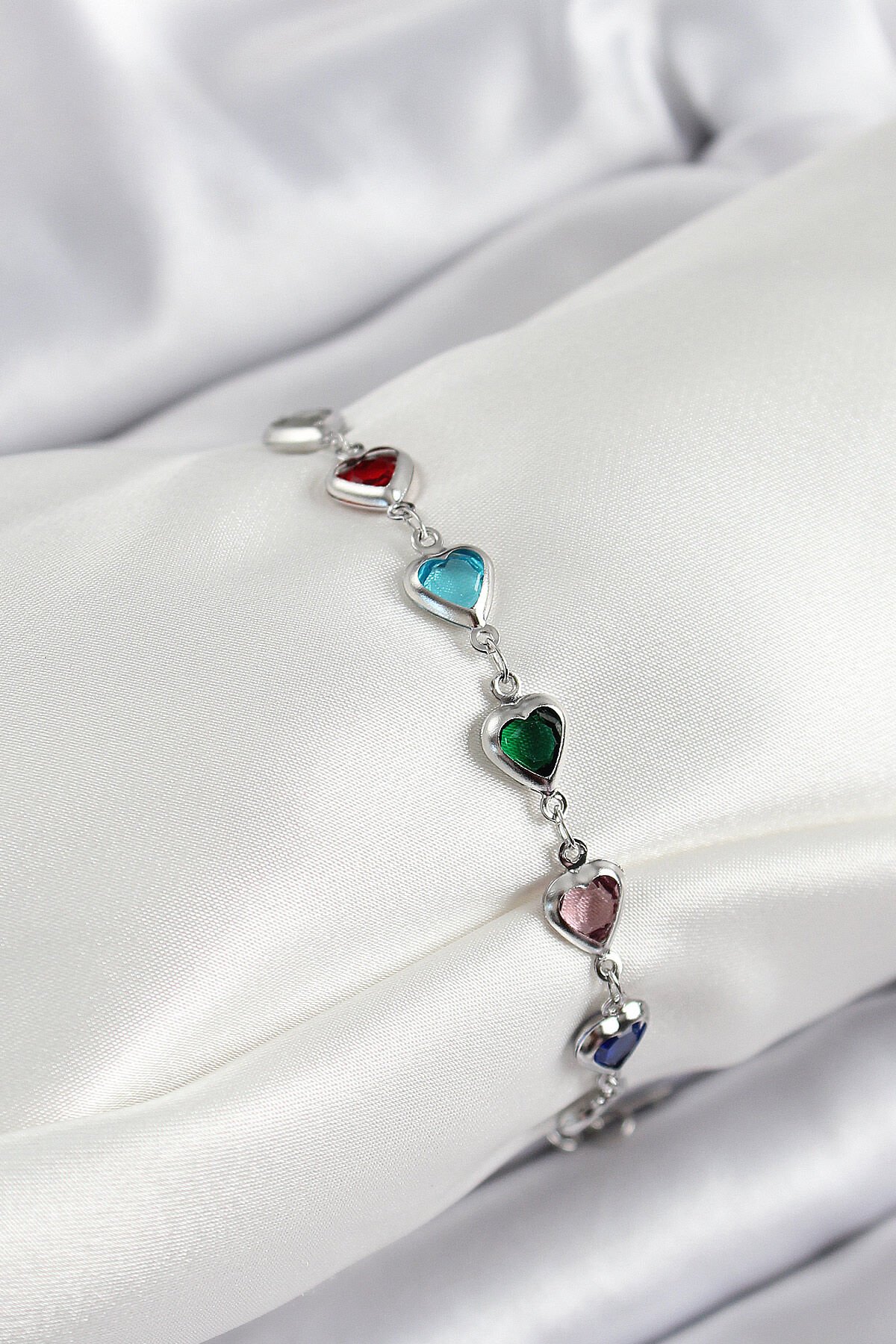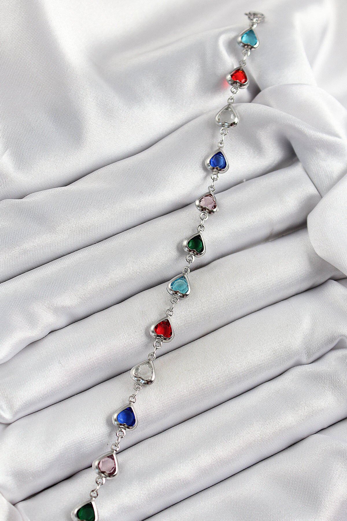 Pirinç Gümüş Renk Karışık Renk Kalp Zirkon Taşlı Kadın Bileklik e_BB7052
