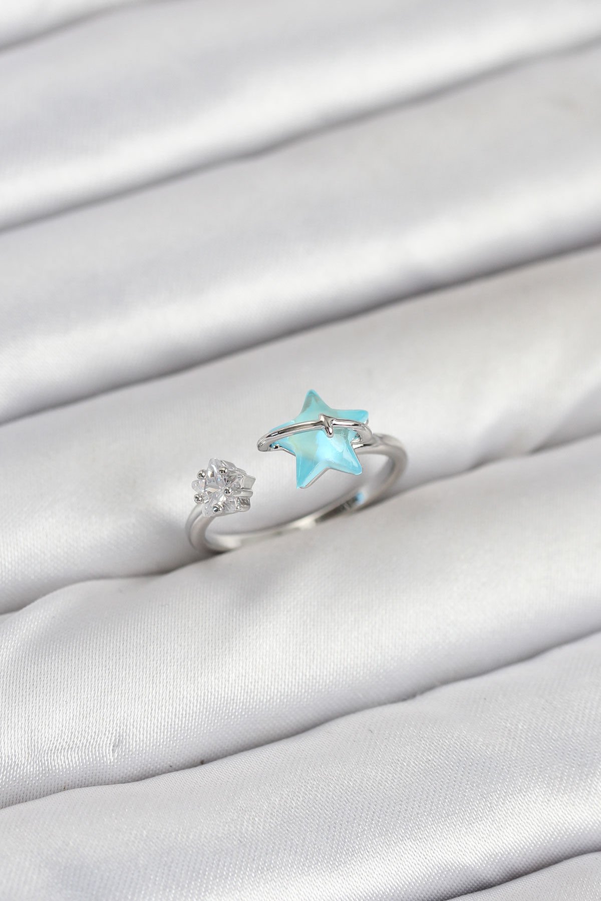 Pirinç Gümüş Renk Mavi Yıldızlı Model Kadın Yüzük e_BYK3869