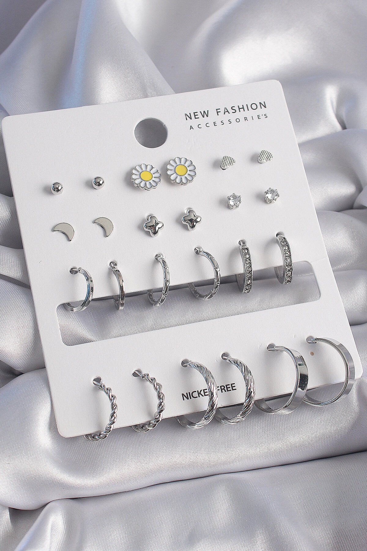 Pirinç Gümüş Renk Papatya Detaylı 12 Çiftli Kadın Küpe Seti e_BKP9686
