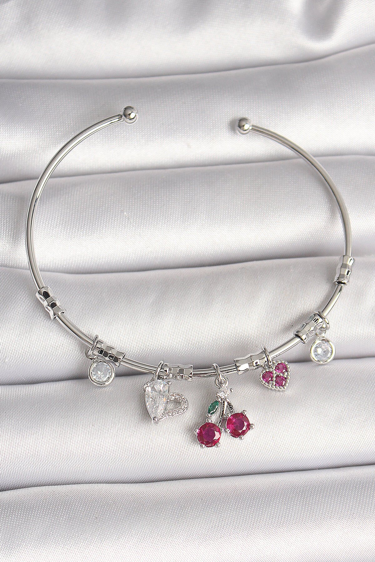 Pirinç Gümüş Renk Sallantı Kiraz Figür Kalp Detay Charm Kadın Bileklik