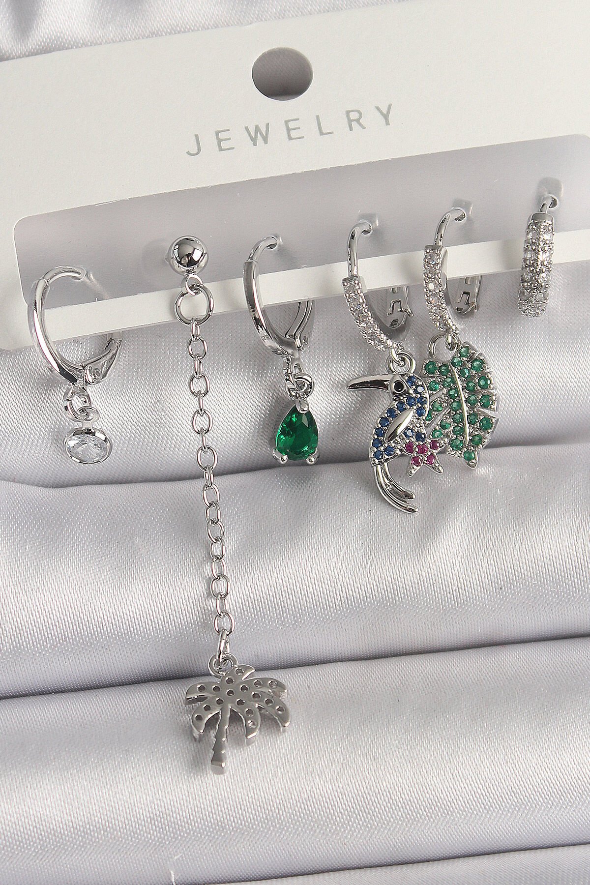 Pirinç Gümüş Renk Sallantı Zirkon Taşlı Ağaç Figür Çoklu Kadın Küpe Seti