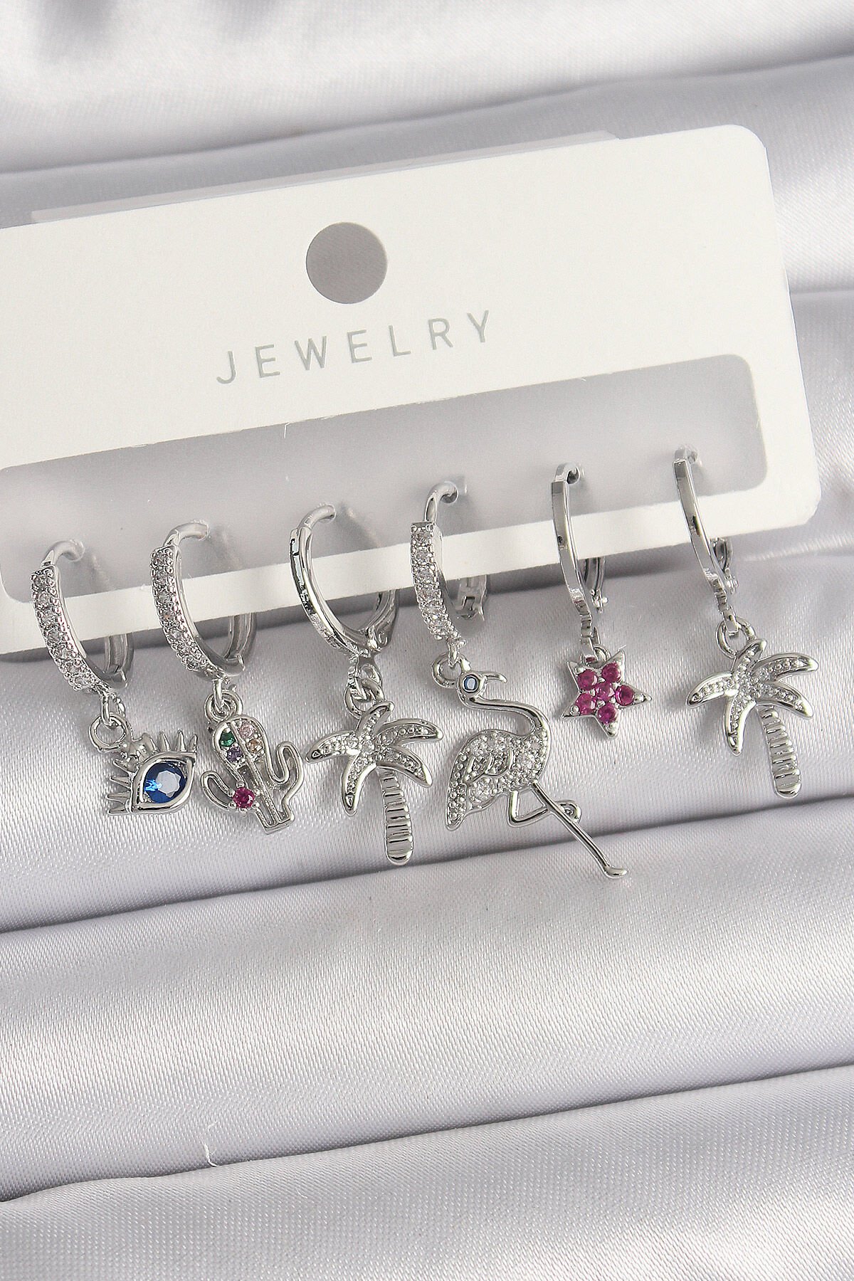 Pirinç Gümüş Renk Sallantı Zirkon Taşlı Deve Kuşu Figür Çoklu Kadın Küpe Seti