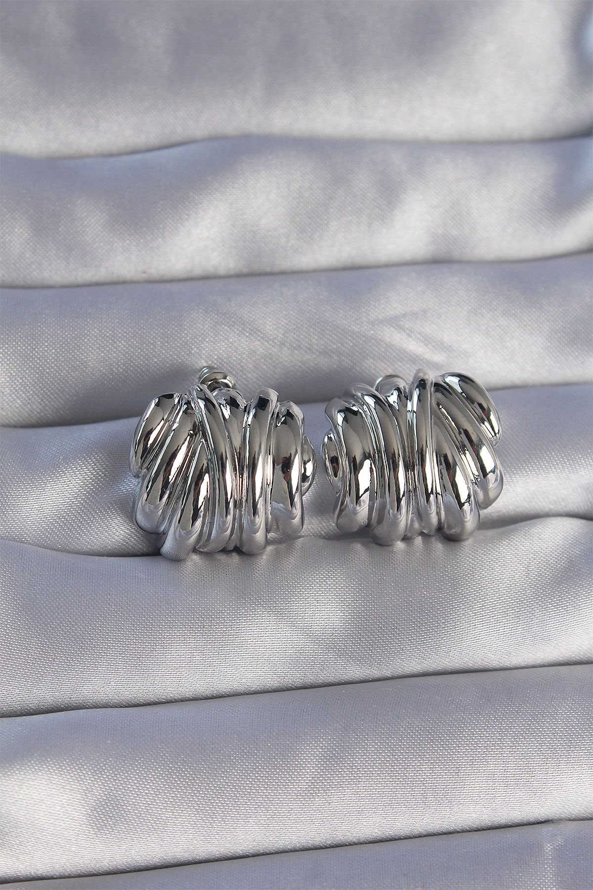 Pirinç Gümüş Renk Tırtıklı Bombe Model Küpe e_BKP9088