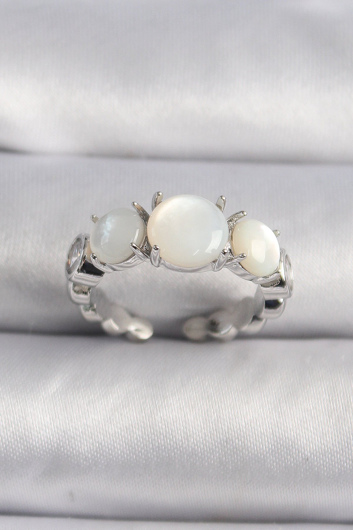 Pirinç Gümüş Renk Zirkon Taş Detaylı Beyaz Sedefli VIP Seri Kadın Yüzük