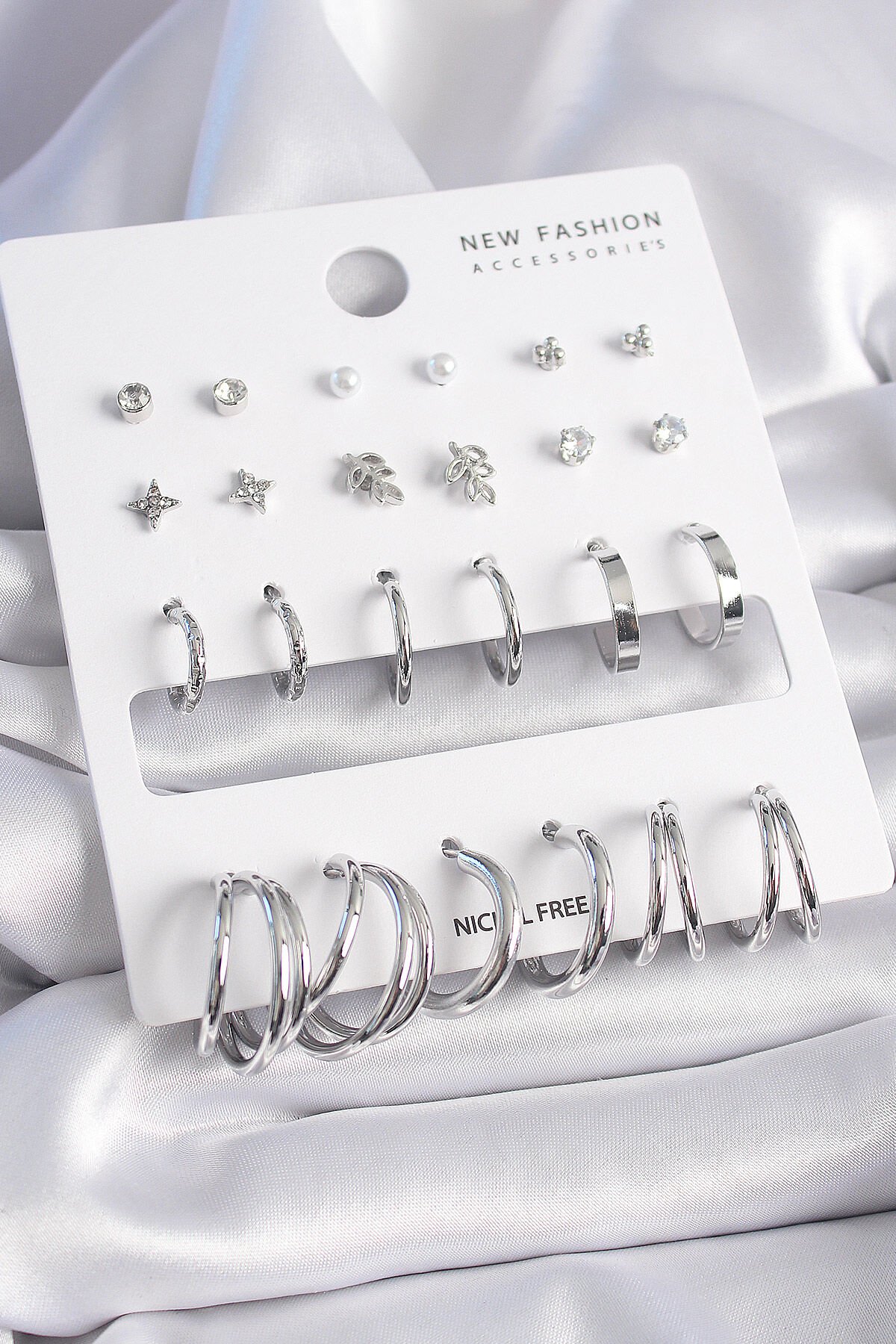 Pirinç Gümüş Renk Zirkon Taşlı 12 Çift Küpe Seti e_BKP9681