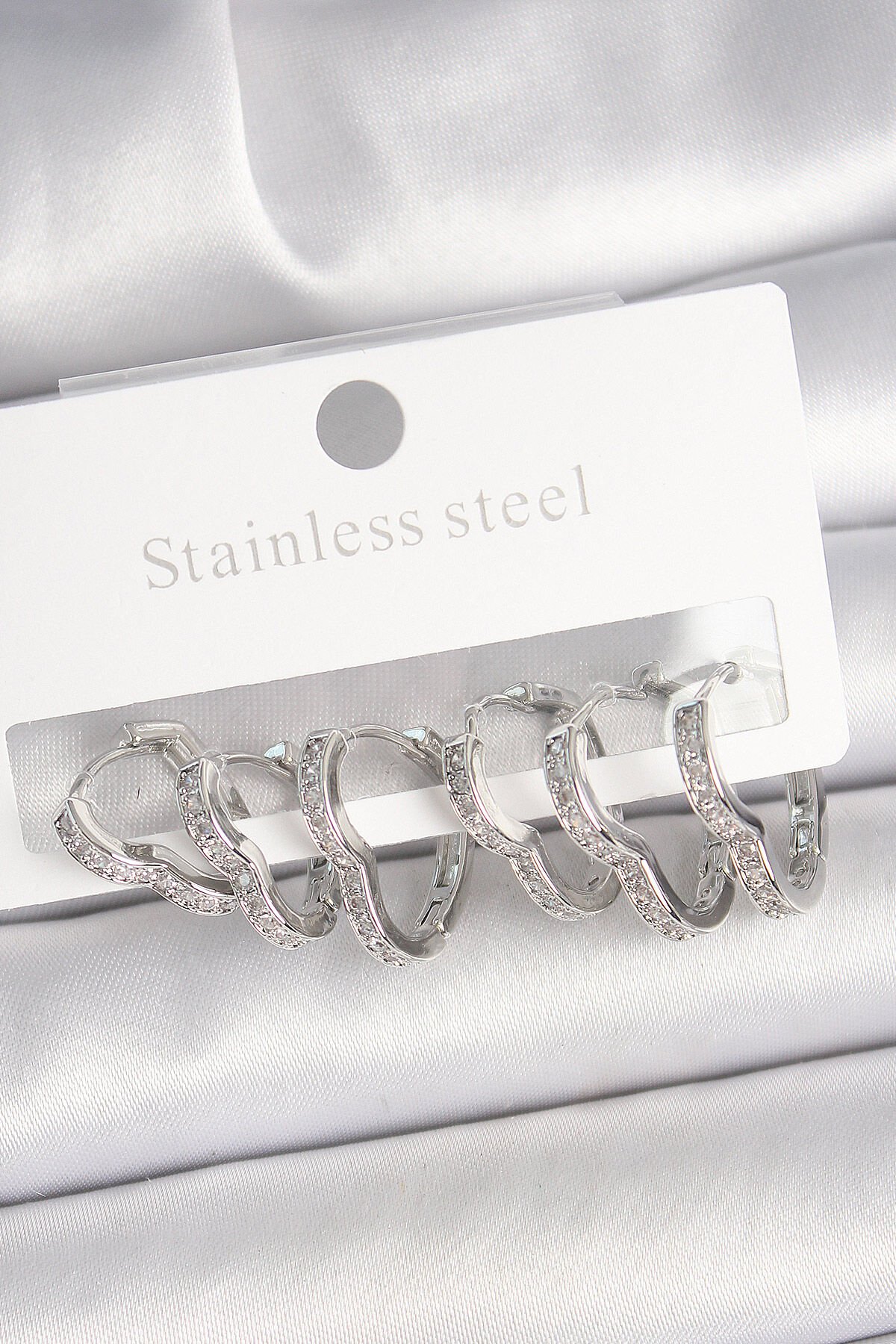 Pirinç Gümüş Renk Zirkon Taşlı 3 Çift Kalp Model Kadın Küpe