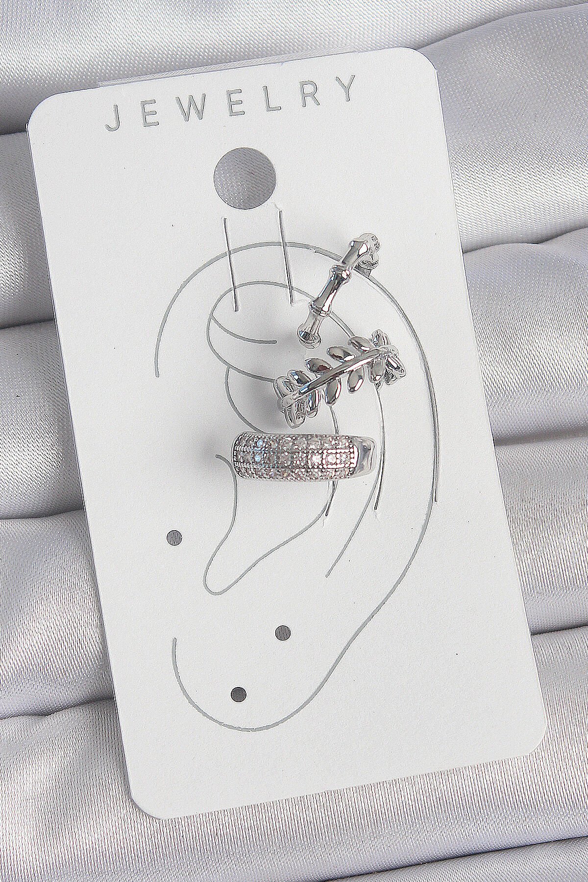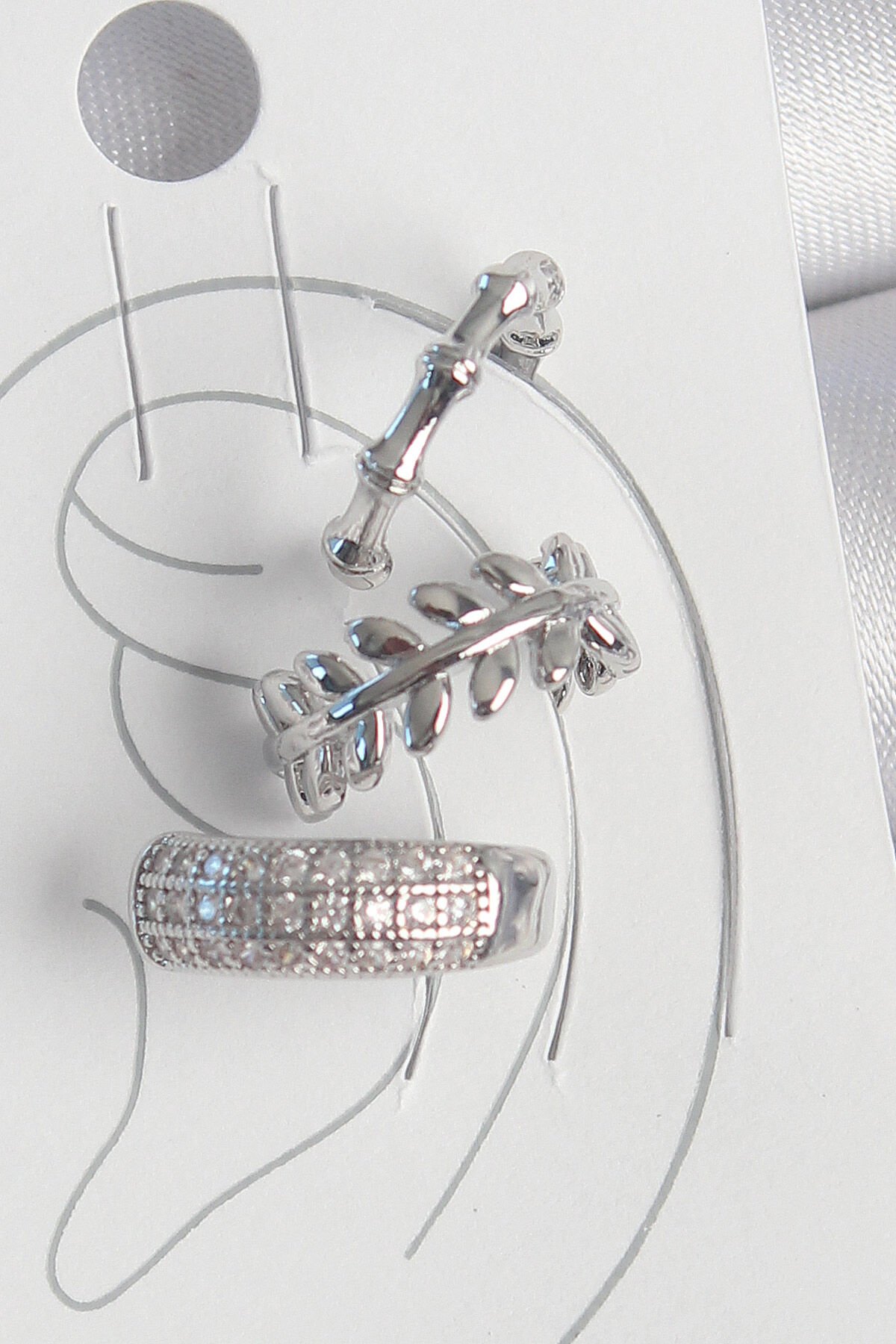 Pirinç Gümüş Renk Zirkon Taşlı 3'Lü Model Yaprak Figür Kadın Kıkırdak Küpe