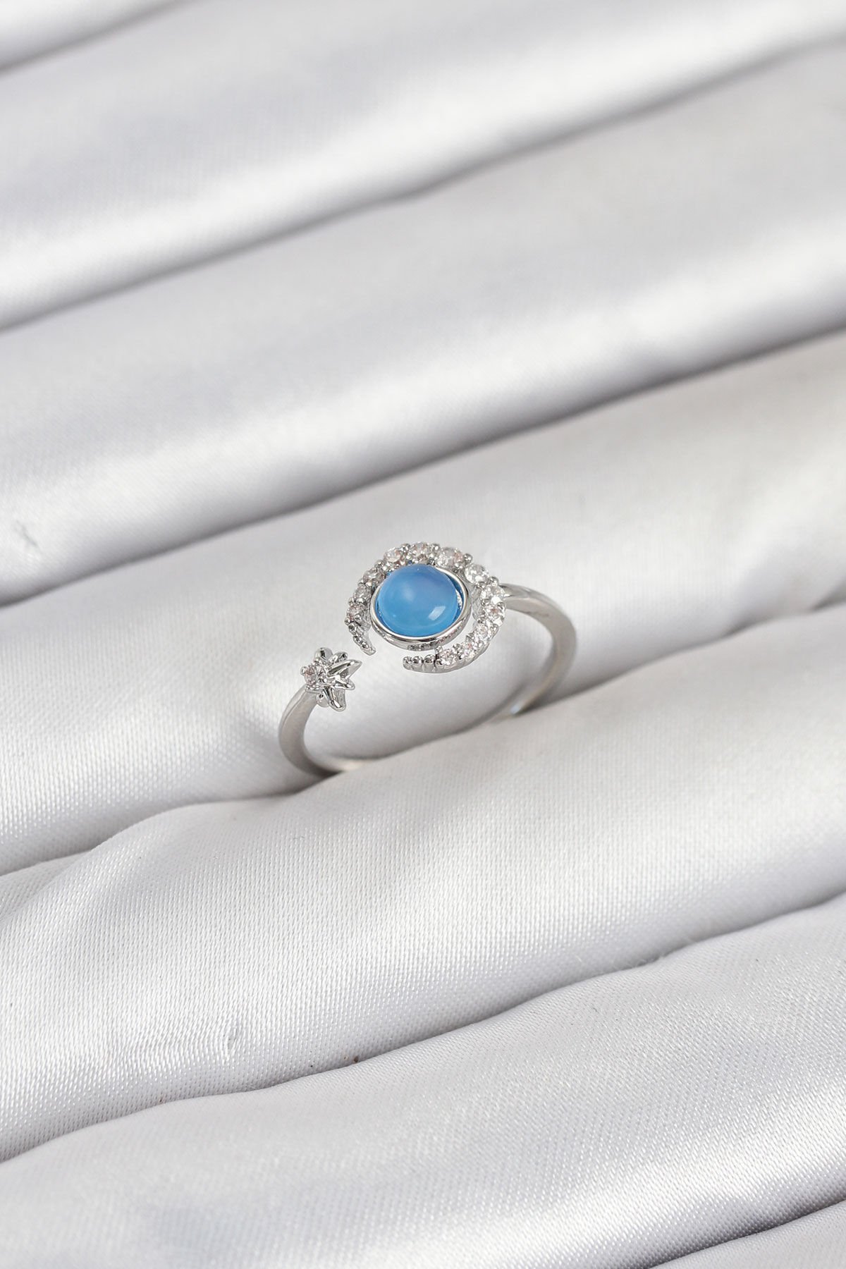Pirinç Gümüş Renk Zirkon Taşlı Ay Yıldız Kadın Yüzük e_BYK3861