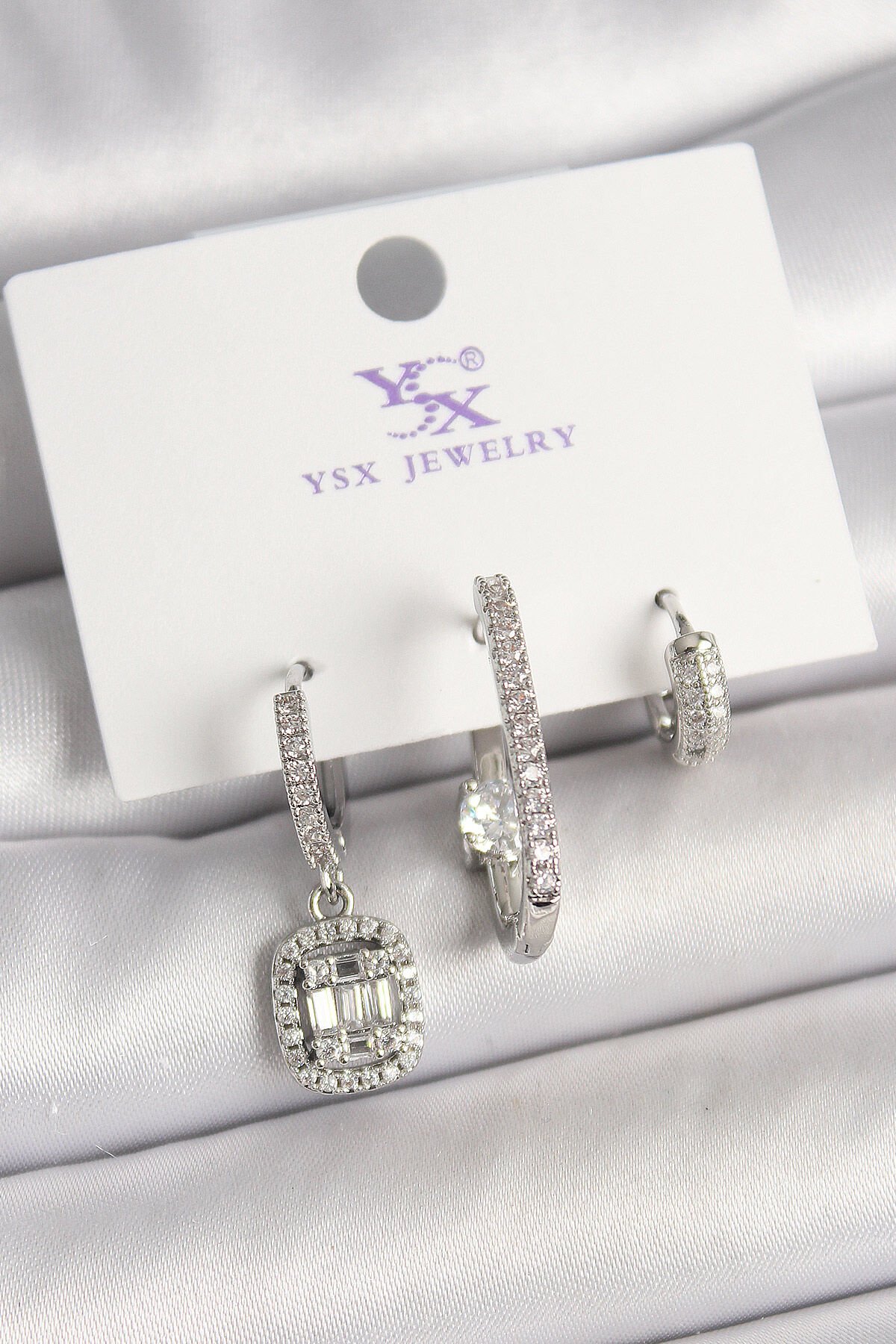 Pirinç Gümüş Renk Zirkon Taşlı Baget Halka Model 3'Lü Kadın Kombin Küpe
