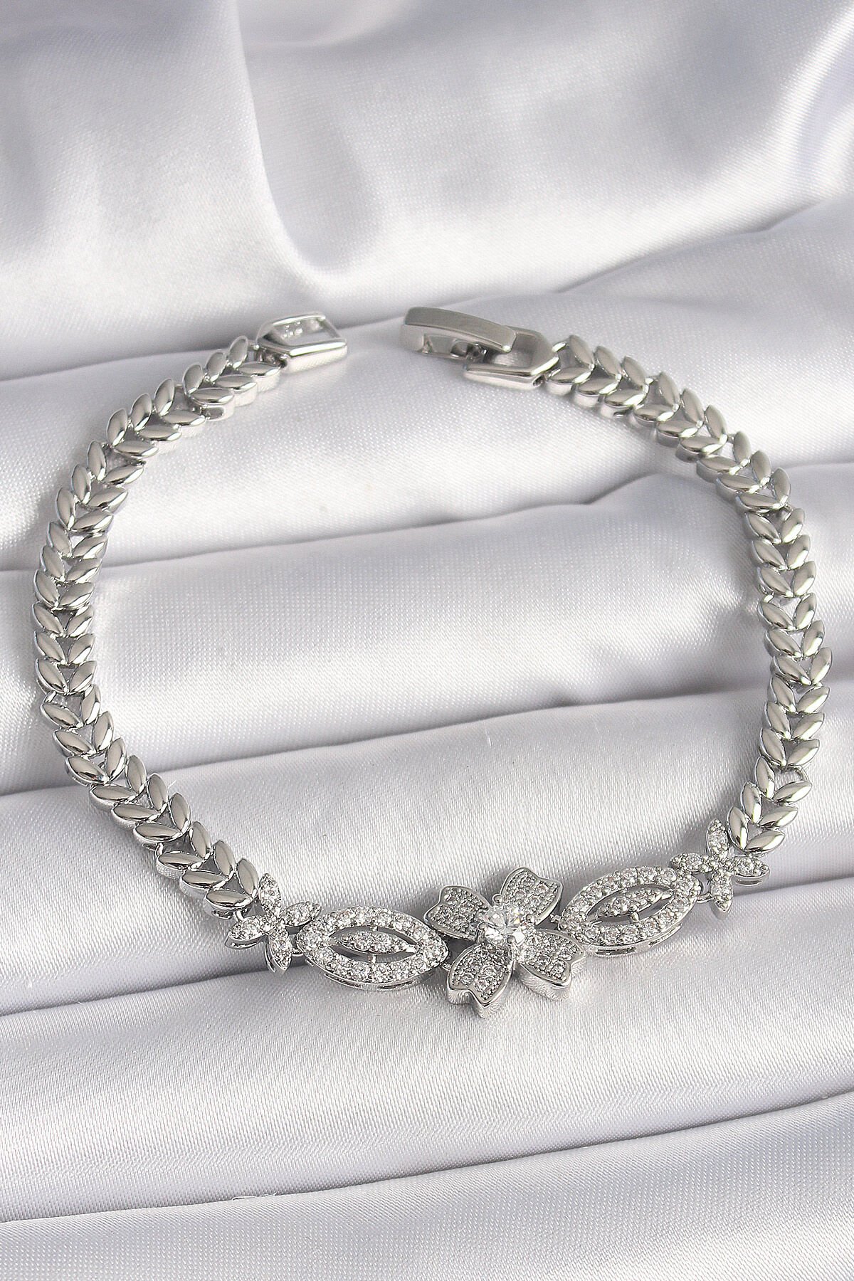 Pirinç Gümüş Renk Zirkon Taşlı Çiçek Figür Arpa Zincir Model Kadın Bileklik