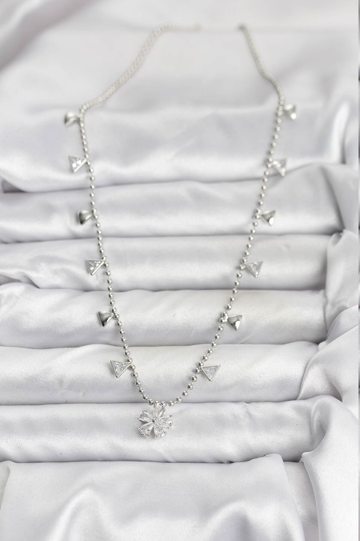 Pirinç Gümüş Renk Zirkon Taşlı Çiçek Model Kadın Kolye