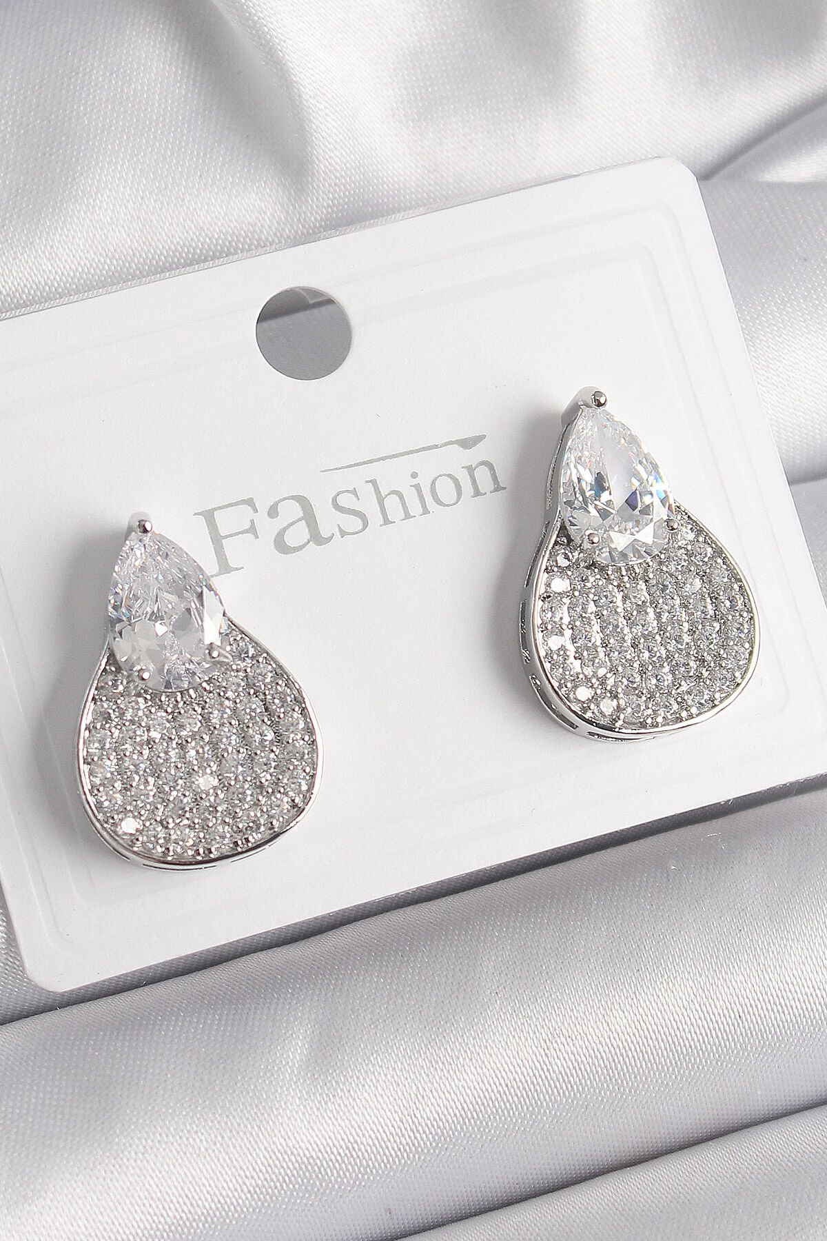 Pirinç Gümüş Renk Zirkon Taşlı Damla Model Kadın Küpe e_BKP9871