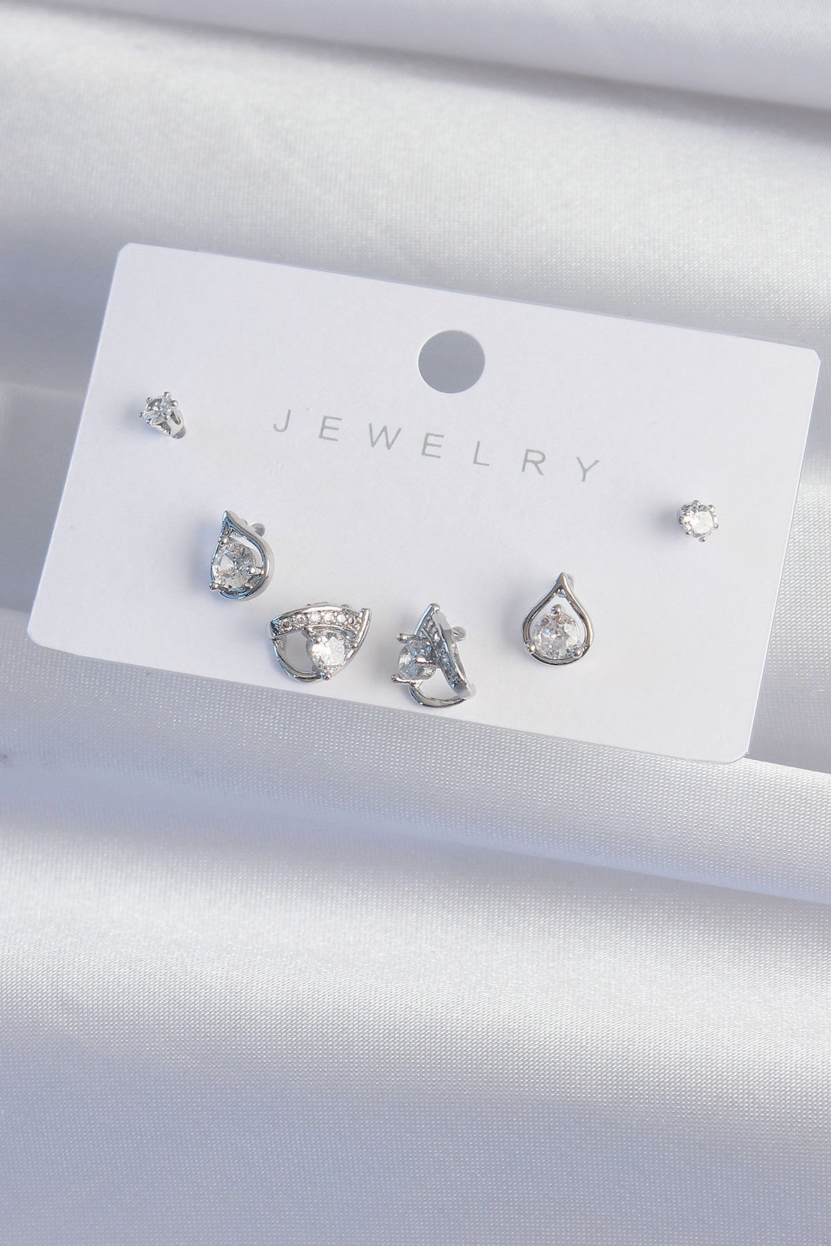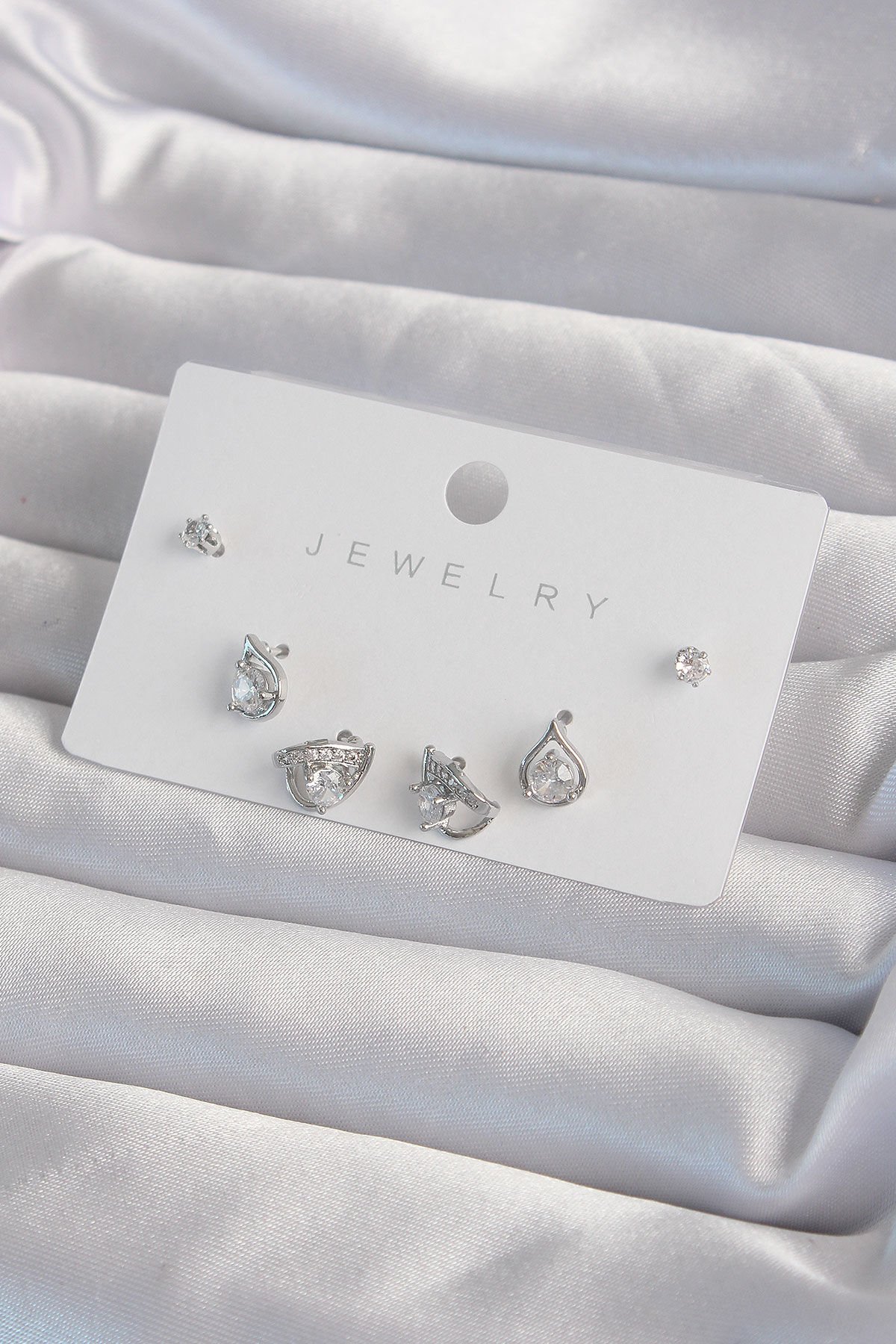 Pirinç Gümüş Renk Zirkon Taşlı Damla Model Küpe Seti e_BKP9320