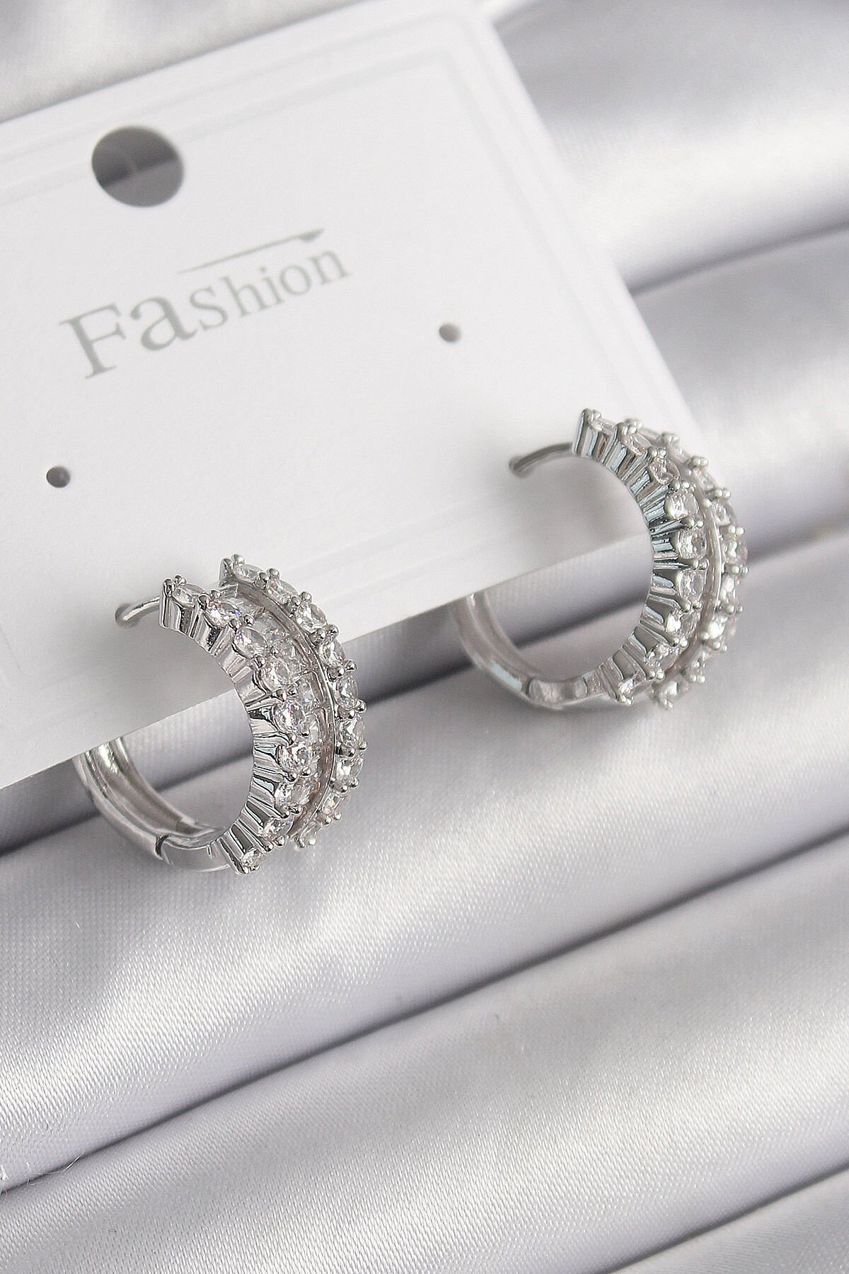 Pirinç Gümüş Renk Zirkon Taşlı Halka Model Kadın Küpe
