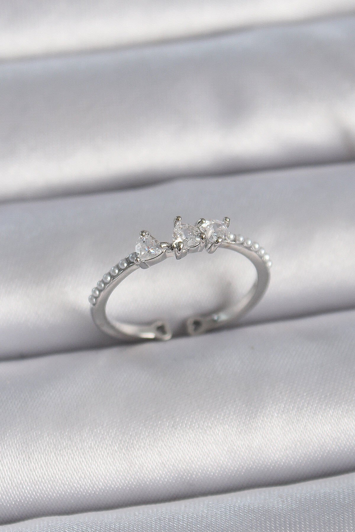 Pirinç Gümüş Renk Zirkon Taşlı Kalp İnci Detay Ayarlanabilir Model Kadın Yüzük