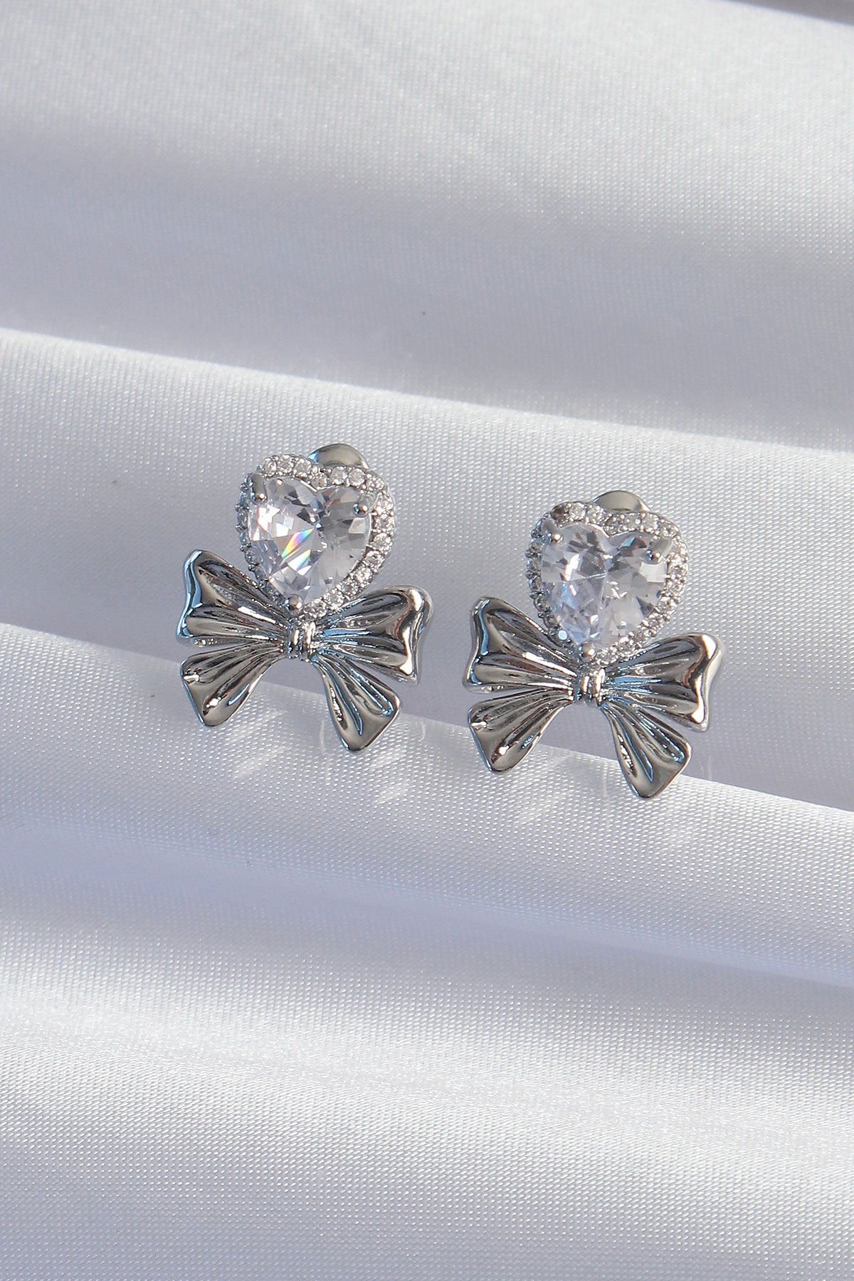 Pirinç Gümüş Renk Zirkon Taşlı Kalp Model Fiyonk Küpe e_BKP9310