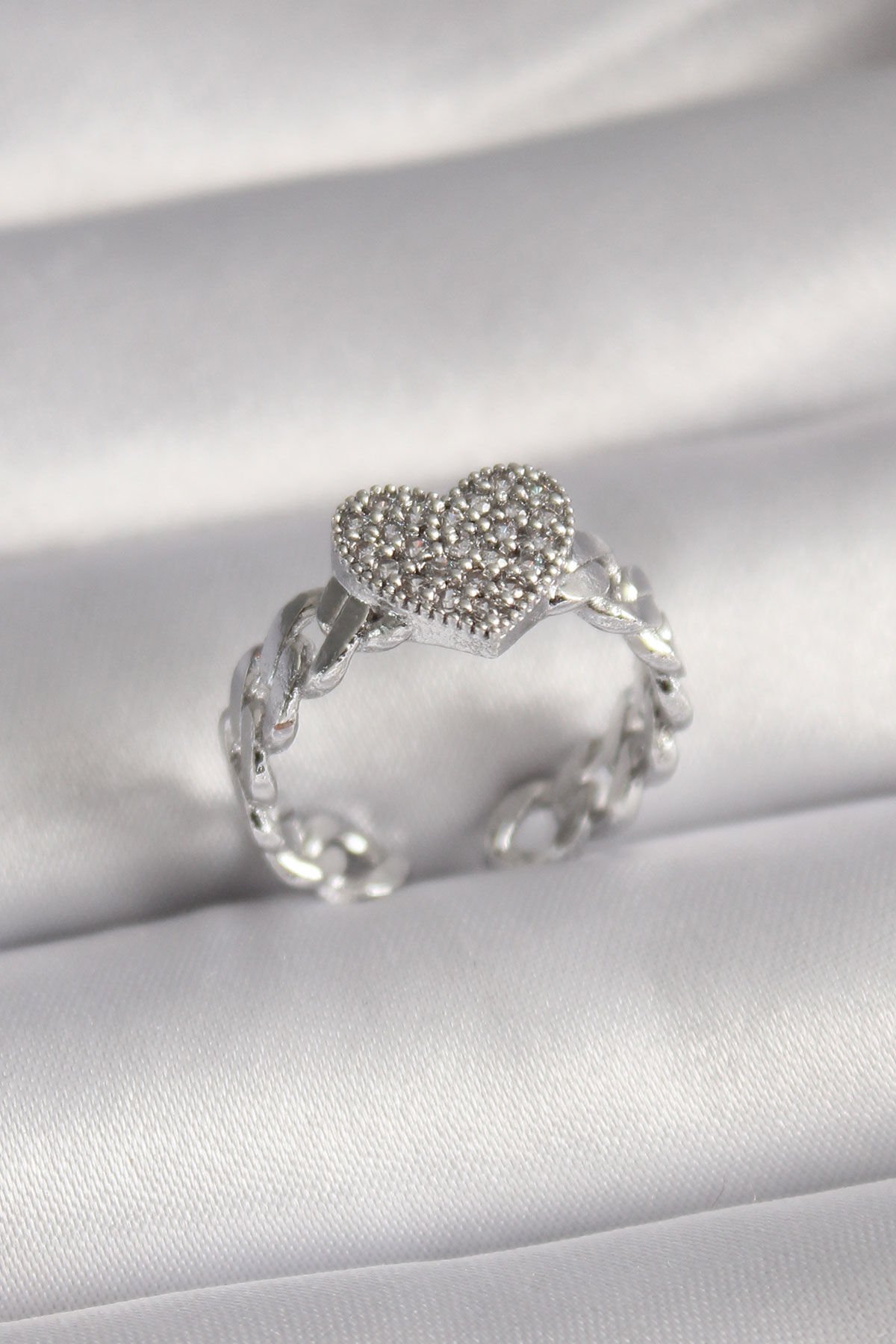 Pirinç Gümüş Renk Zirkon Taşlı Kalp Model Kadın Yüzük