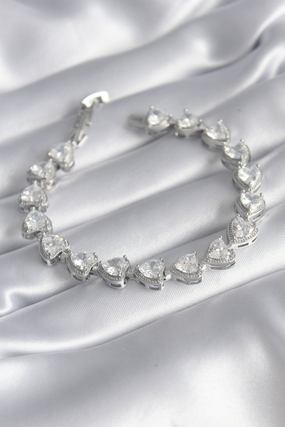 Pirinç Gümüş Renk Zirkon Taşlı Kalp Model VIP Seri Kadın Bileklik e_BB5844
