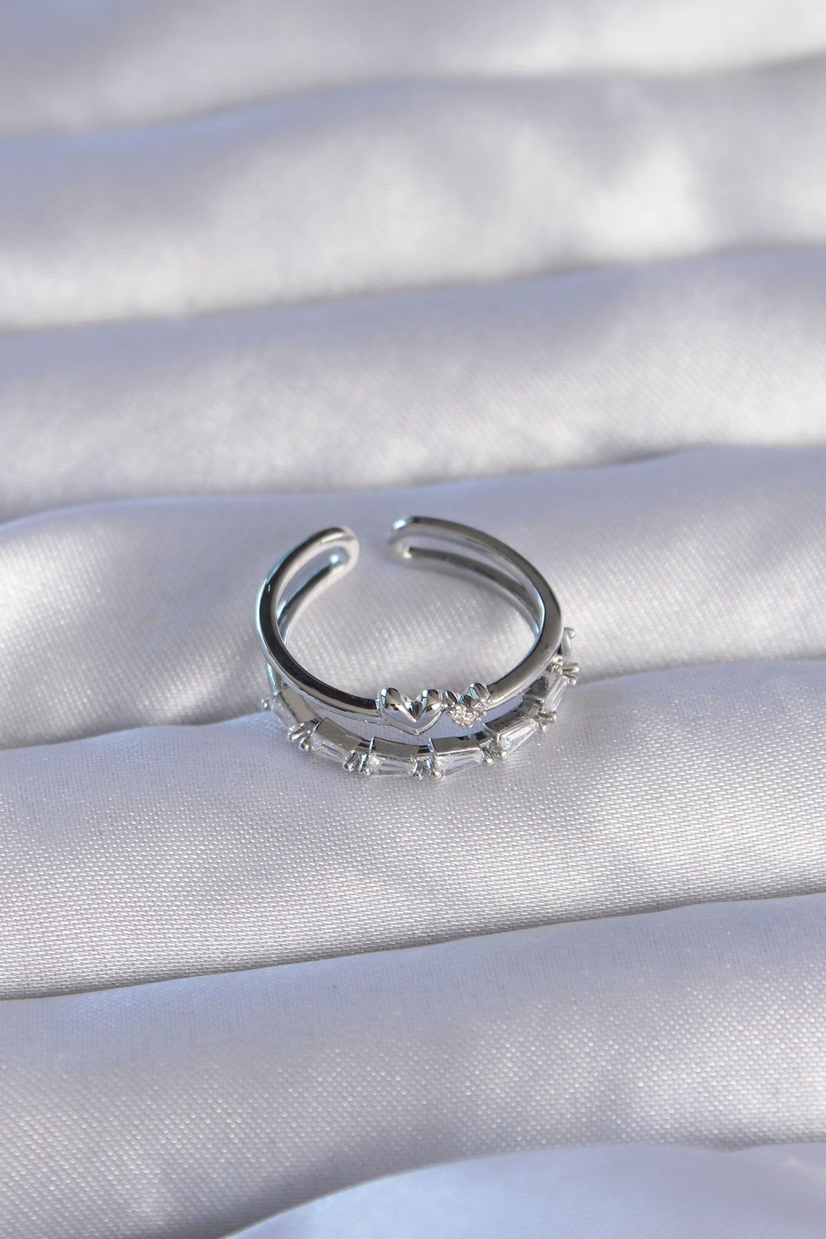 Pirinç Gümüş Renk Zirkon Taşlı Kalpli 2li Görünüm Ayarlanabilir Yüzük