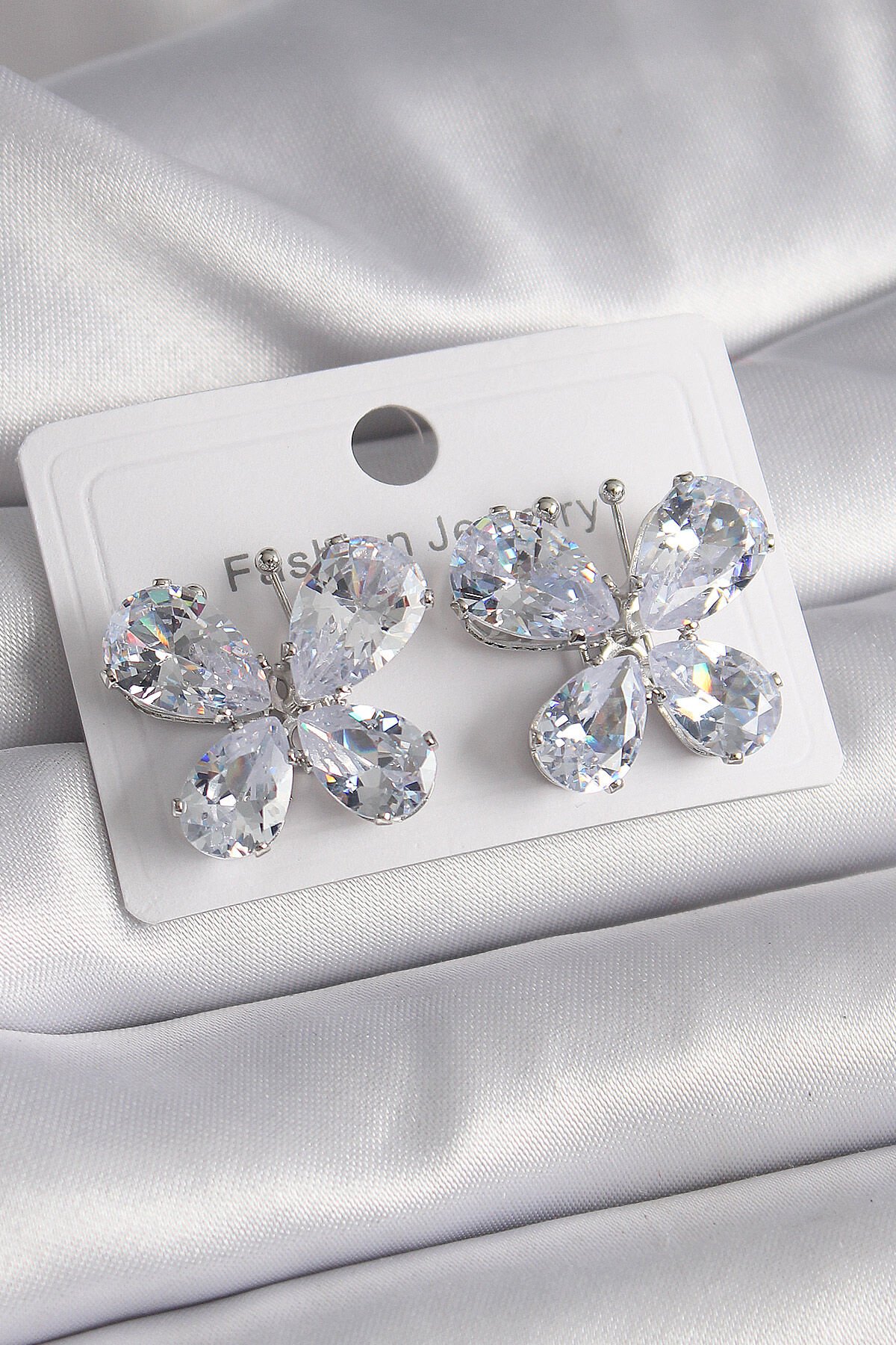 Pirinç Gümüş Renk Zirkon Taşlı Kelebek Model Kadın Küpe