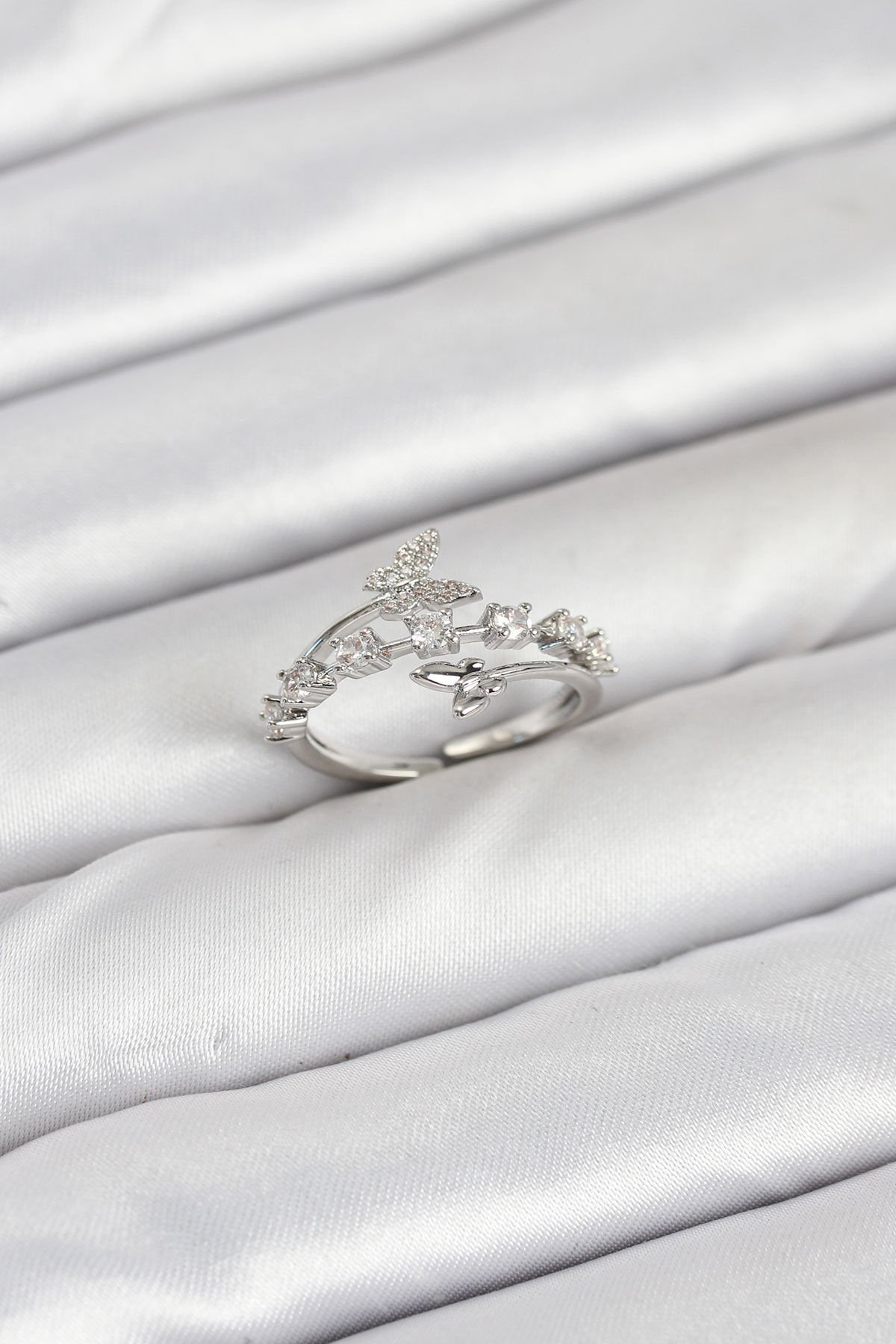 Pirinç Gümüş Renk Zirkon Taşlı Kelebek Model Kadın Yüzük