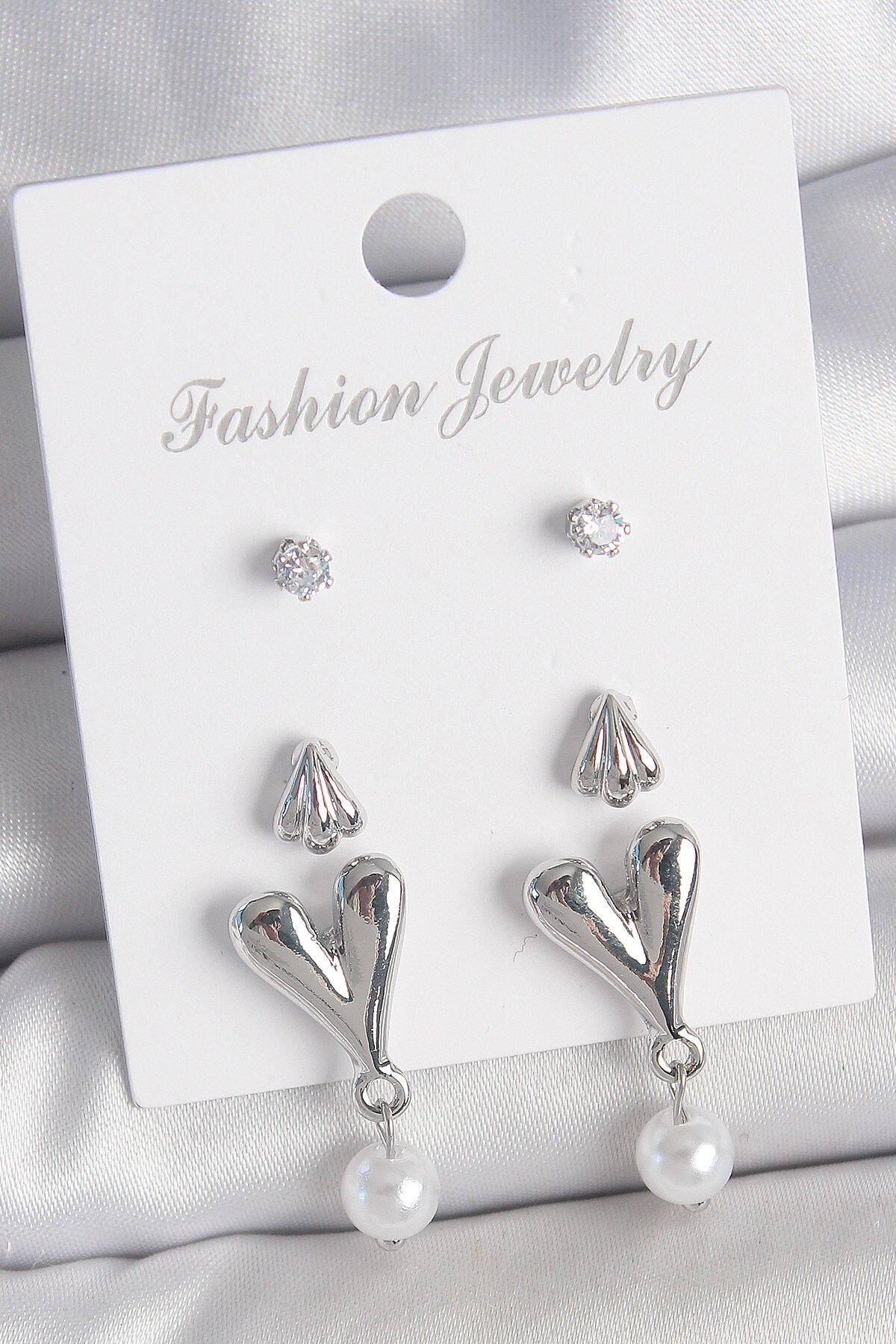 Pirinç Gümüş Renk Zirkon Taşlı Sallantılı Kalp Model 3 Çift Kadın Küpe Seti