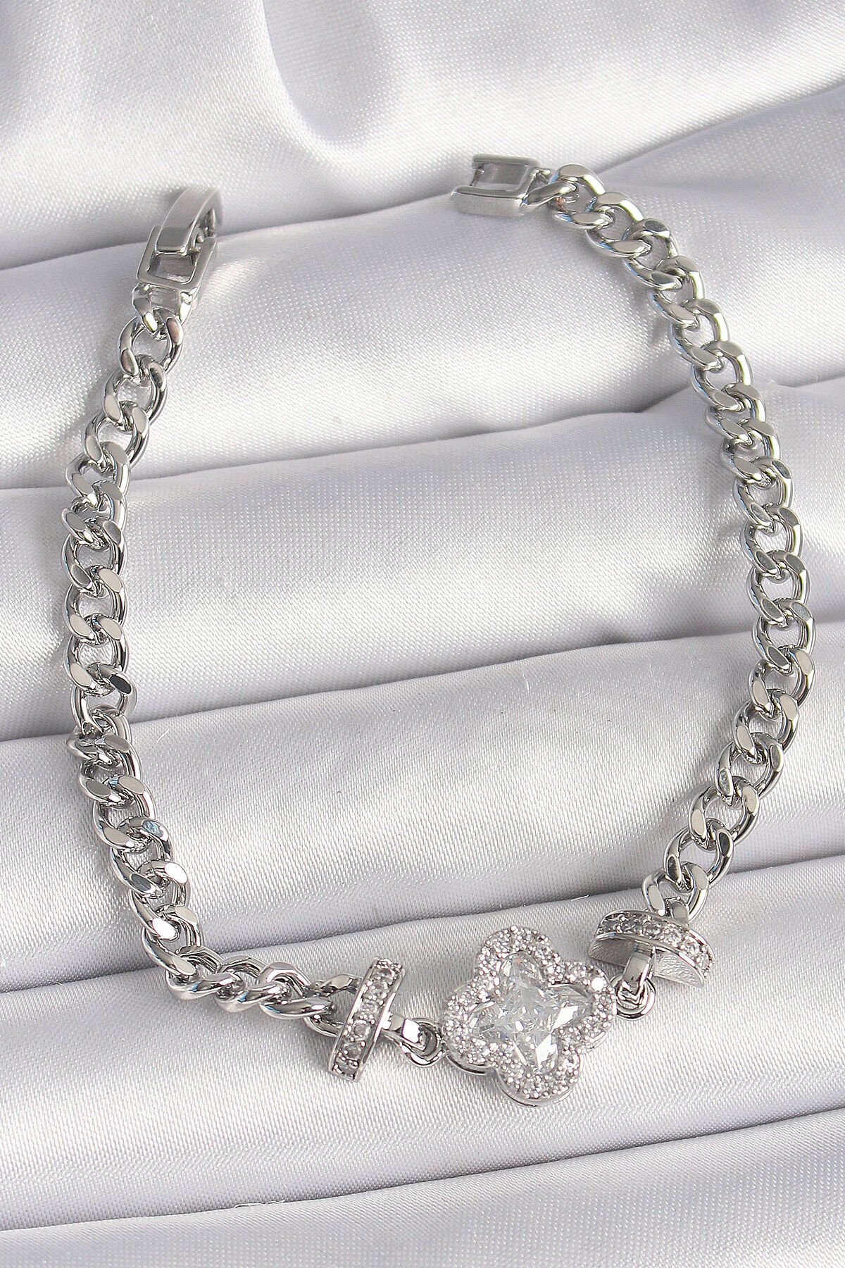 Pirinç Gümüş Renk Zirkon Taşlı Yonca Figür Zincir Model Kadın Bileklik