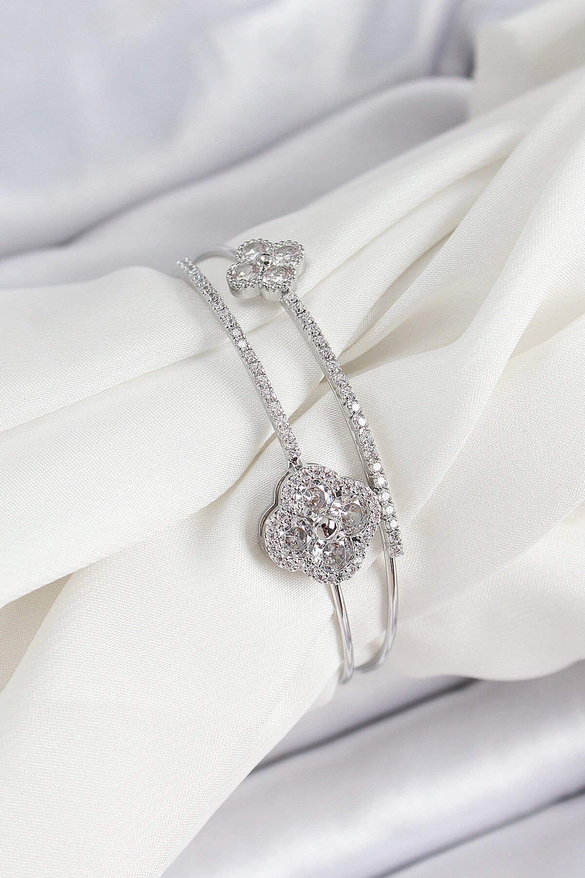 Pirinç Gümüş Renk Zirkon Taşlı Yonca Model 2'li Kadın Bileklik