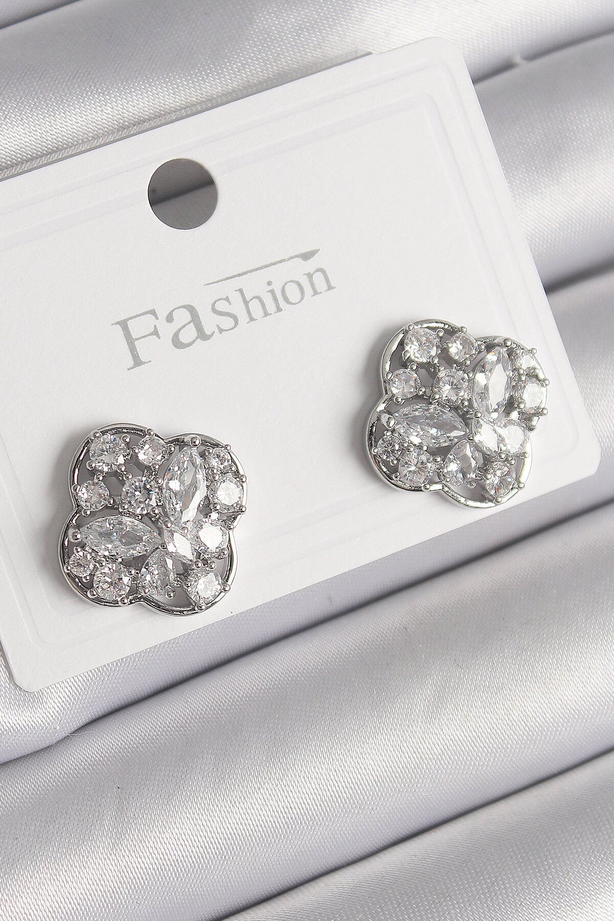 Pirinç Gümüş Renk Zirkon Taşlı Yonca Model Kadın Küpe