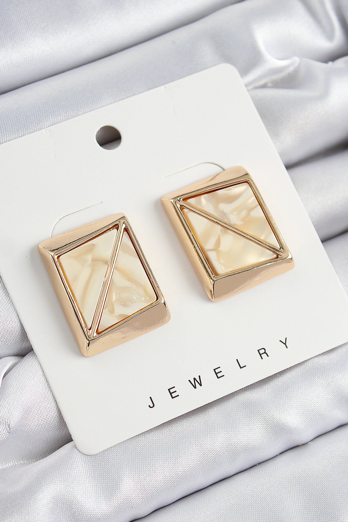 Pirinç Krem Üçgen Kesim Detaylı Kare Model Vintage Gold Renk Kadın Küpe