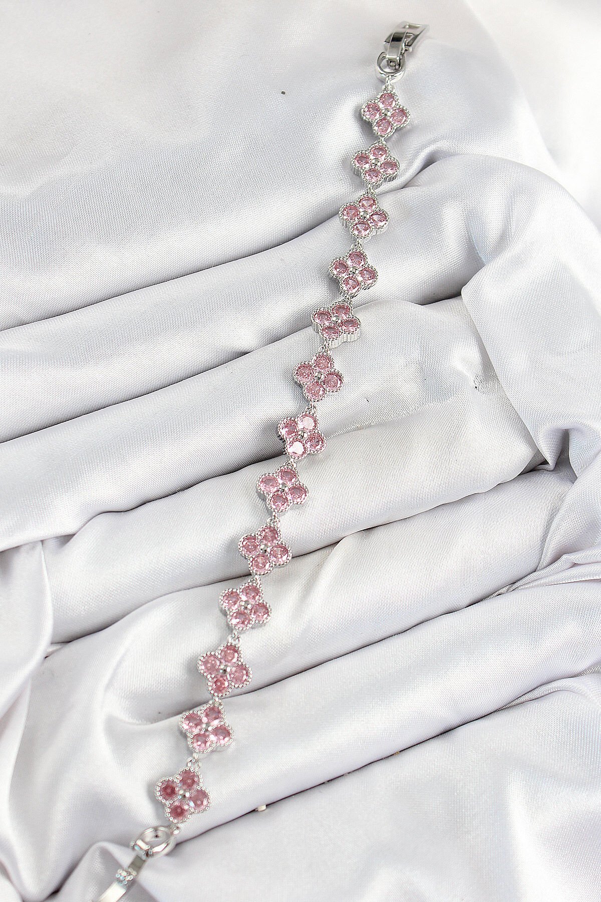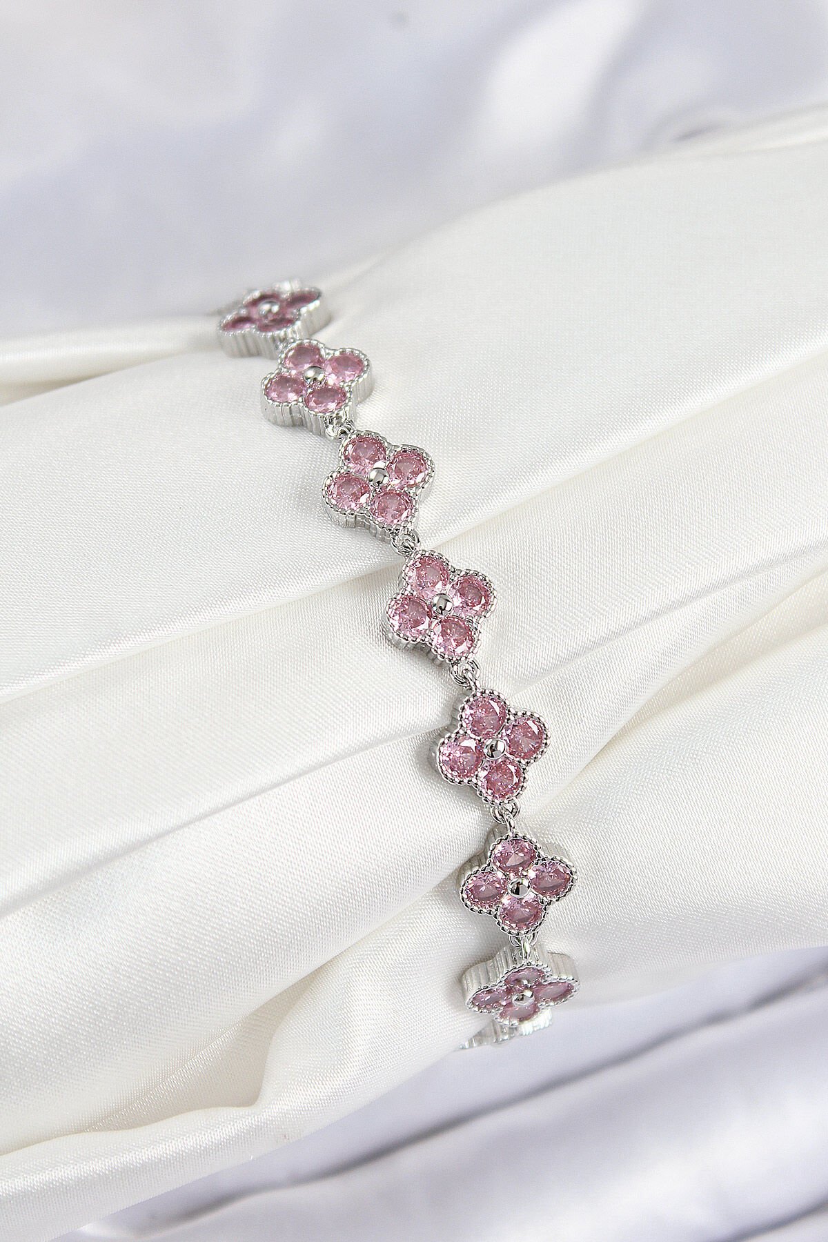 Pirinç Pembe Zirkon Taşlı Yonca Model Gümüş Renk VIP Seri Kadın Bileklik