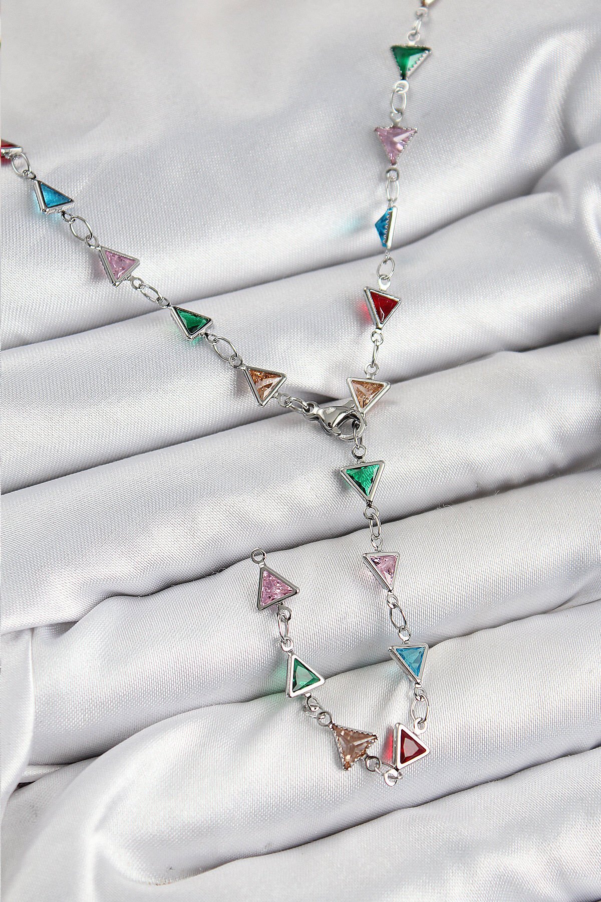 Pirinç Renkli Zirkon Taşlı Üçgen Model Gümüş Renk Kadın Y Kolye e_BKO10383