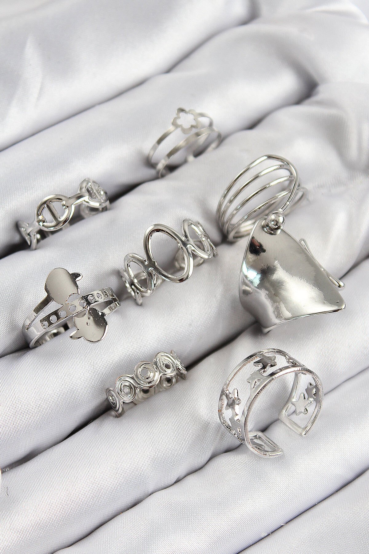 Pirinç Sarmal Ve Yıldız Model Gümüş Renk Kadın Yüzük Kombin Set e_BYK3812