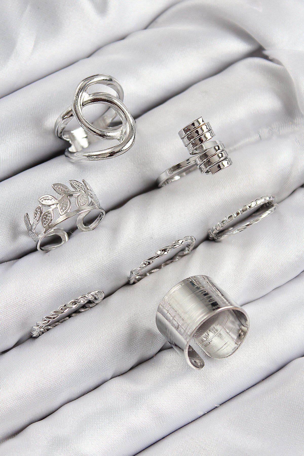 Pirinç Yaprak Model Gümüş Renk Kadın Yüzük Kombin Set e_BYK3818