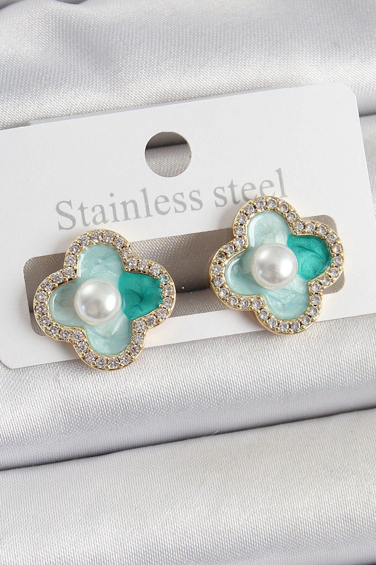 Pirinç Yeşil Mineli İnci Detaylı Zirkon Taşlı Sanatsal Portre Yonca Model Gold Renk Kadın Küpe