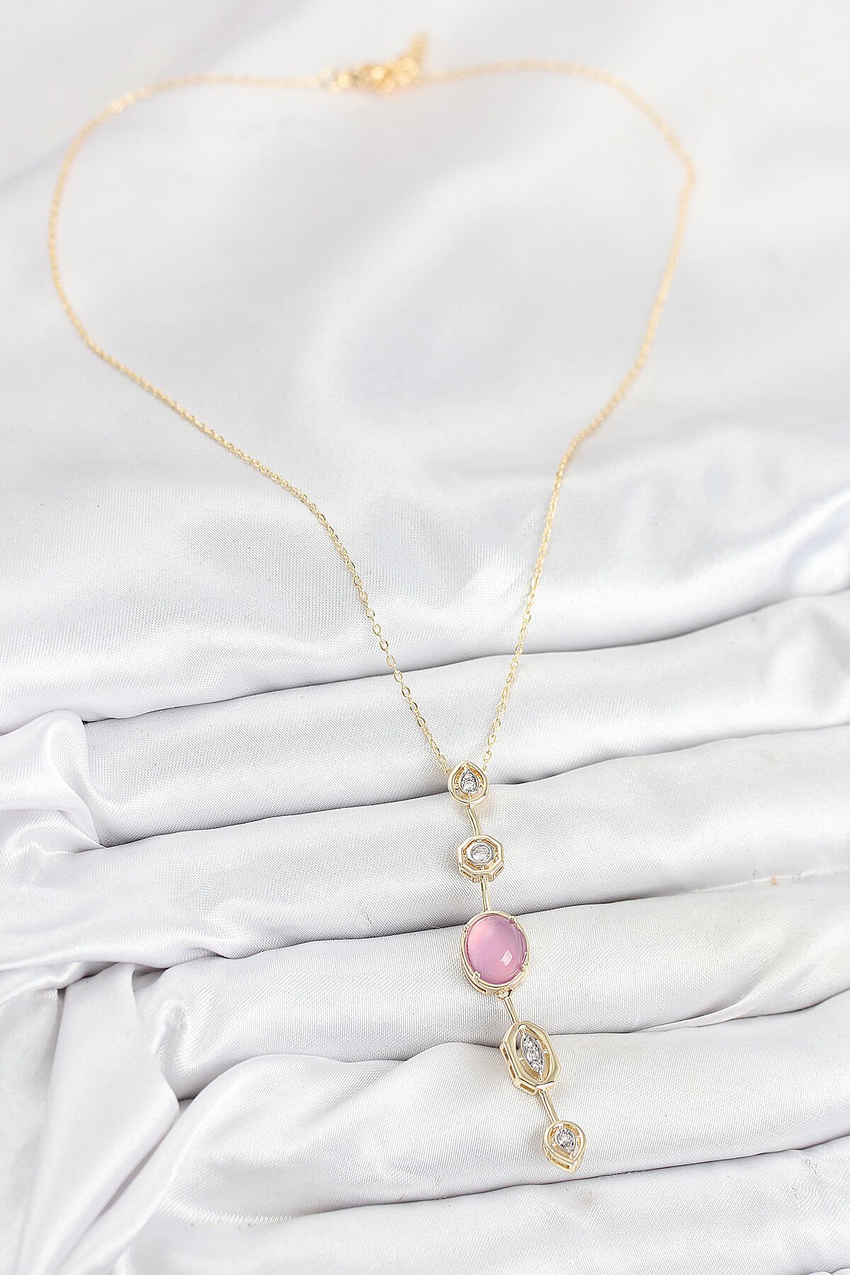 Pirinç Zincir Pembe Gold Renk Zirkon Taşlı Y Kolye e_BKO10554